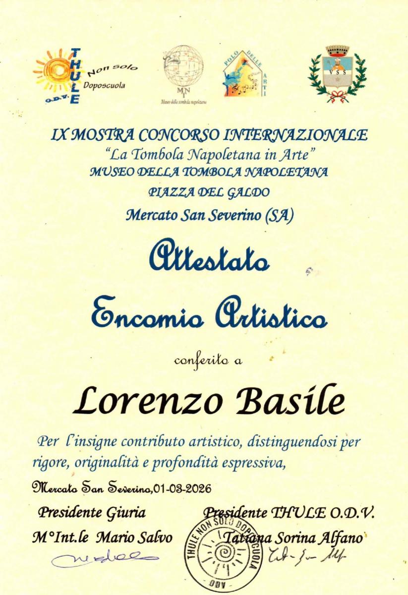 2025- Mercato S. Severino- Museo della tombola napoletana- Dal 13 dicembre 2025 al 1 marzo 2026 mostra- concorso a cura dell’Associazione Thule- non solo doposcuola ODV.- Attestato Encomio artistico