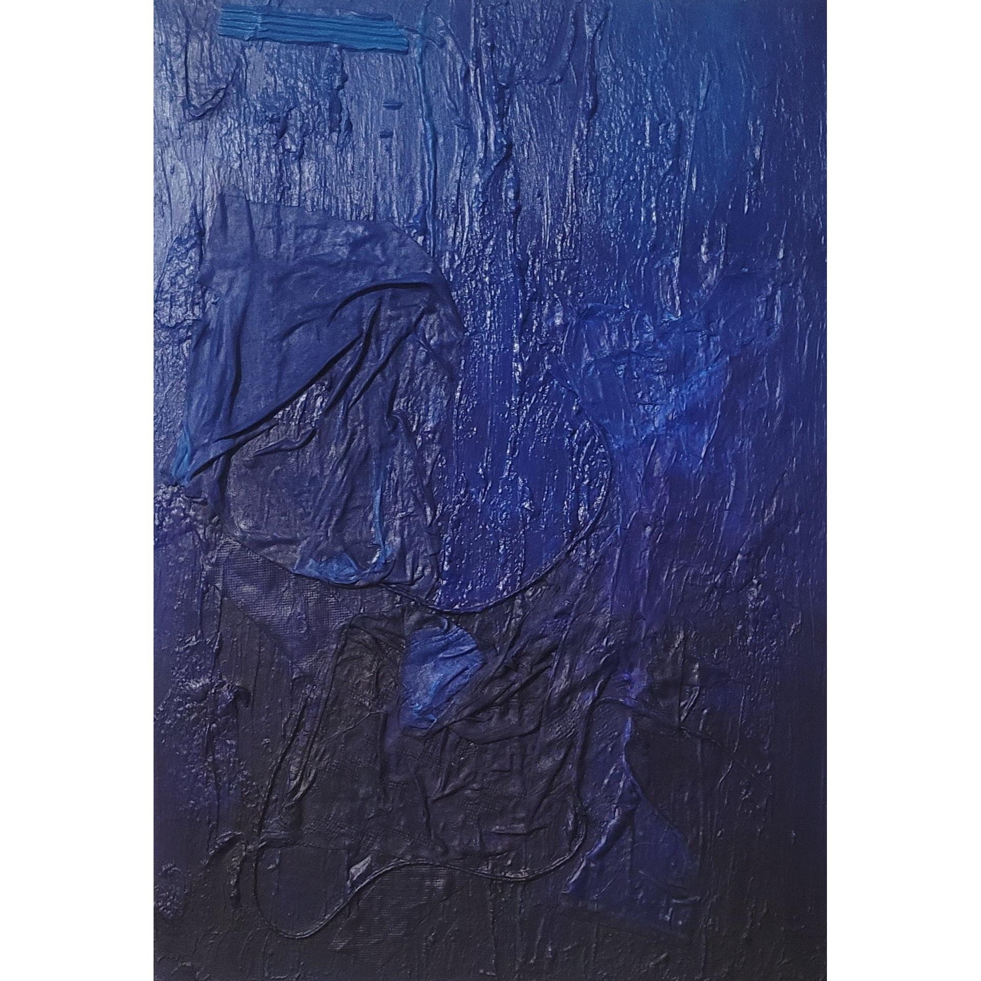 Il blu, nella sua intensità profonda, evoca una dimensione emotiva complessa: è il colore dell’infinito, dell’oceano e del cielo, ma anche della malinconia e della contemplazione. In quest’opera, il blu sembra diventare uno spazio da esplorare, un territorio che parla di memoria, accumulo e trasformazione.