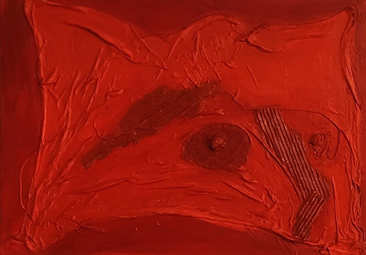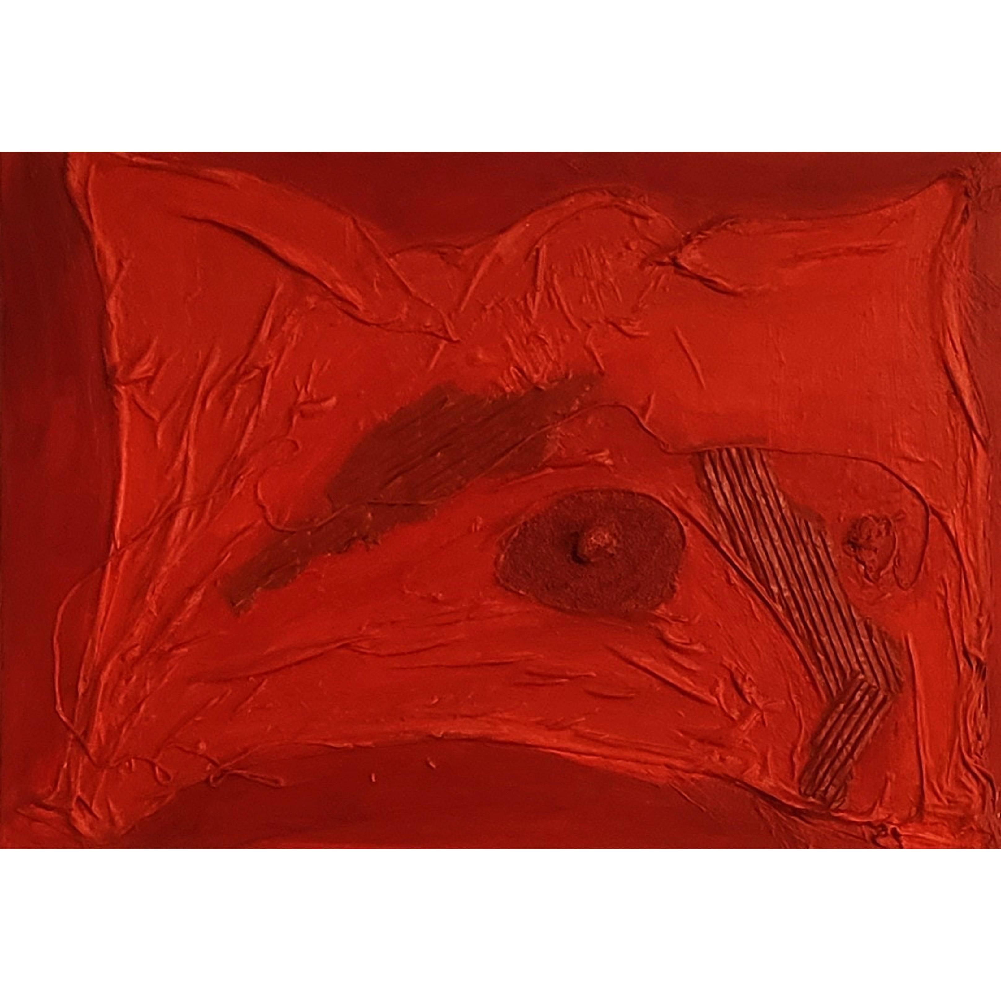 Questa opera d'arte, caratterizzata da una densa monocromia rossa e dauna superficie fortemente materica, si presenta come un'esplorazione visiva ed emotiva della forma e della texture. La composizione è dominata da un rilievo centrale che sembra evocare un occhio astratto o una ferita simbolica, accentuata da contrasti tonali più scuri e solchi profondi nella materia pittorica.