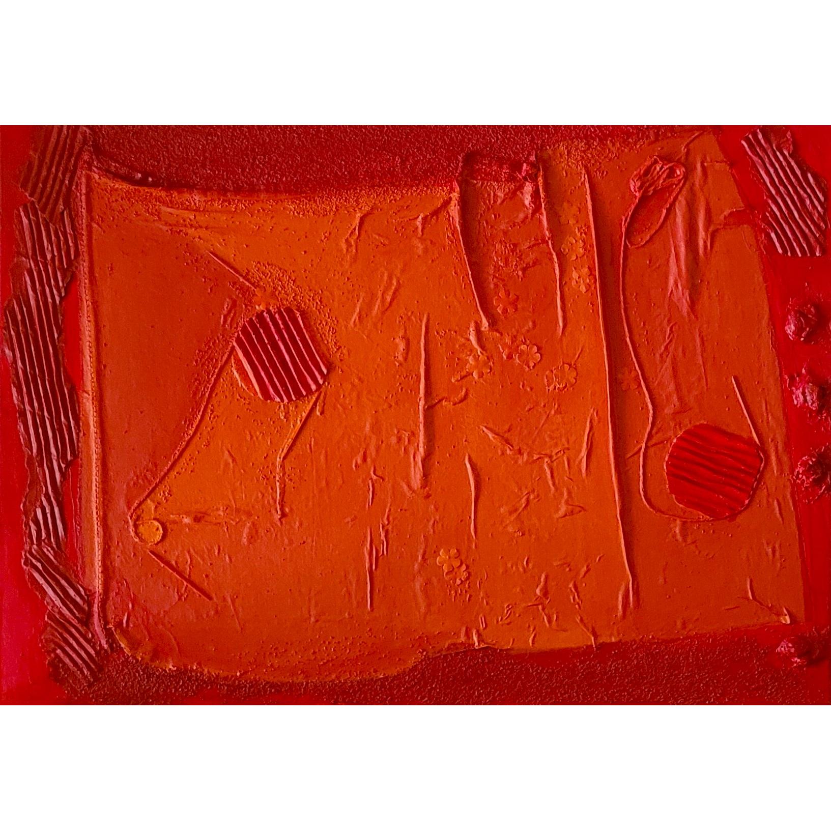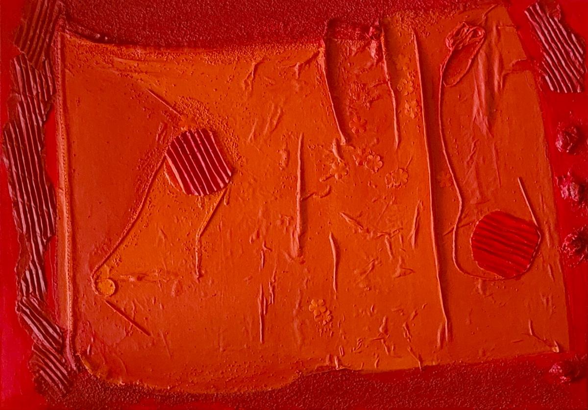 Le forme che emergono – i piccoli rilievi circolari a striatureparallele, le zone più dense ai margini, le leggere improntefloreali – creano una tensione tra casualità e intenzione. Nullasembra disposto in modo narrativo, eppure tutto partecipa a unequilibrio sottile: il rosso uniforme diventa così il collante diuna costellazione di micro-eventi visivi. È un rosso caldo,viscerale, che richiama la materia organica, la terra, il corpo, maanche un’idea di calore emotivo, di energia trattenuta.