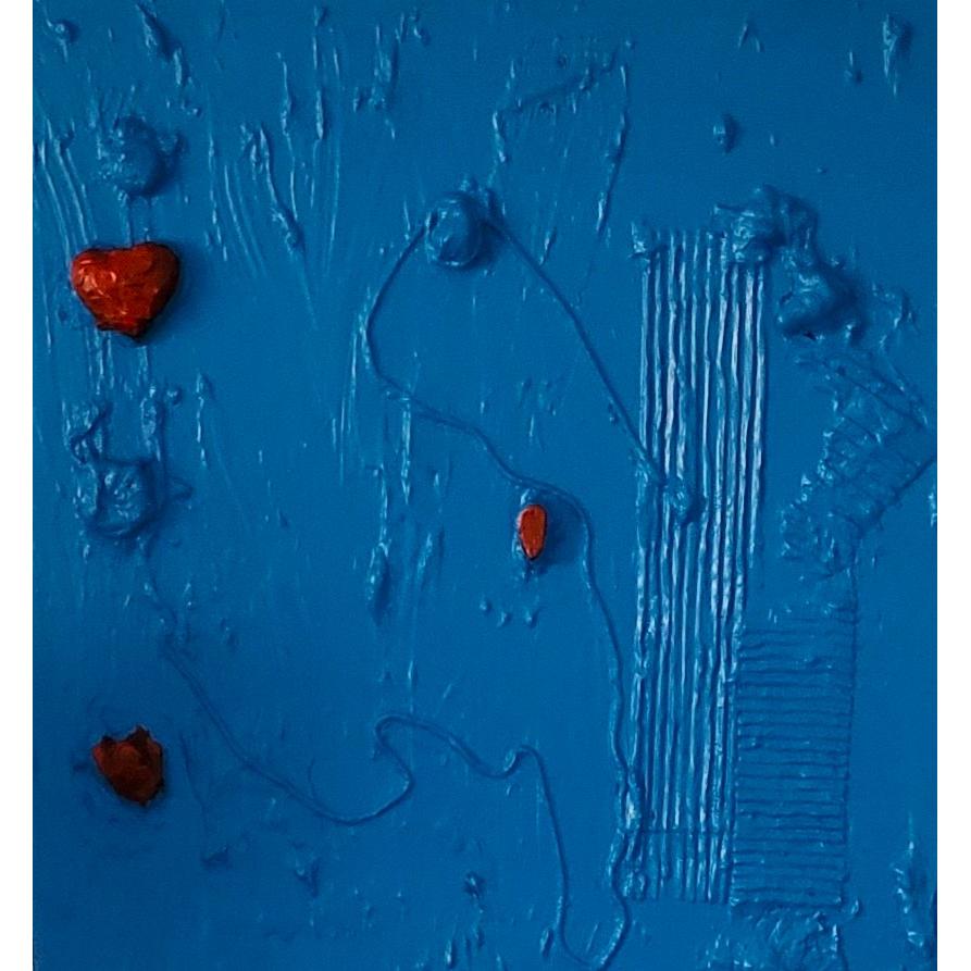 Quest’opera si presenta come una superficie di tensione silenziosa, dove il blu dominante non è semplice sfondo ma materia emotiva. La cromia profonda, quasi marina, avvolge lo sguardo e suggerisce uno spazio mentale più che fisico: un luogo di immersione, di ascolto interiore.