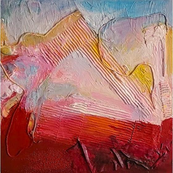 La tavolozza cromatica, dominata da rossi terrosi, rosa polverosi, azzurri attenuati e accenti gialli, crea una tensione costante tra calore e freddezza. I rossi nella parte inferiore sembrano ancorare l’opera a una dimensione tellurica, mentre le tonalità più chiare e fredde nella parte superiore evocano uno spazio aereo, instabile, quasi in dissoluzione. Questa dicotomia suggerisce un dialogo tra peso e leggerezza, tra radicamento e slancio.
