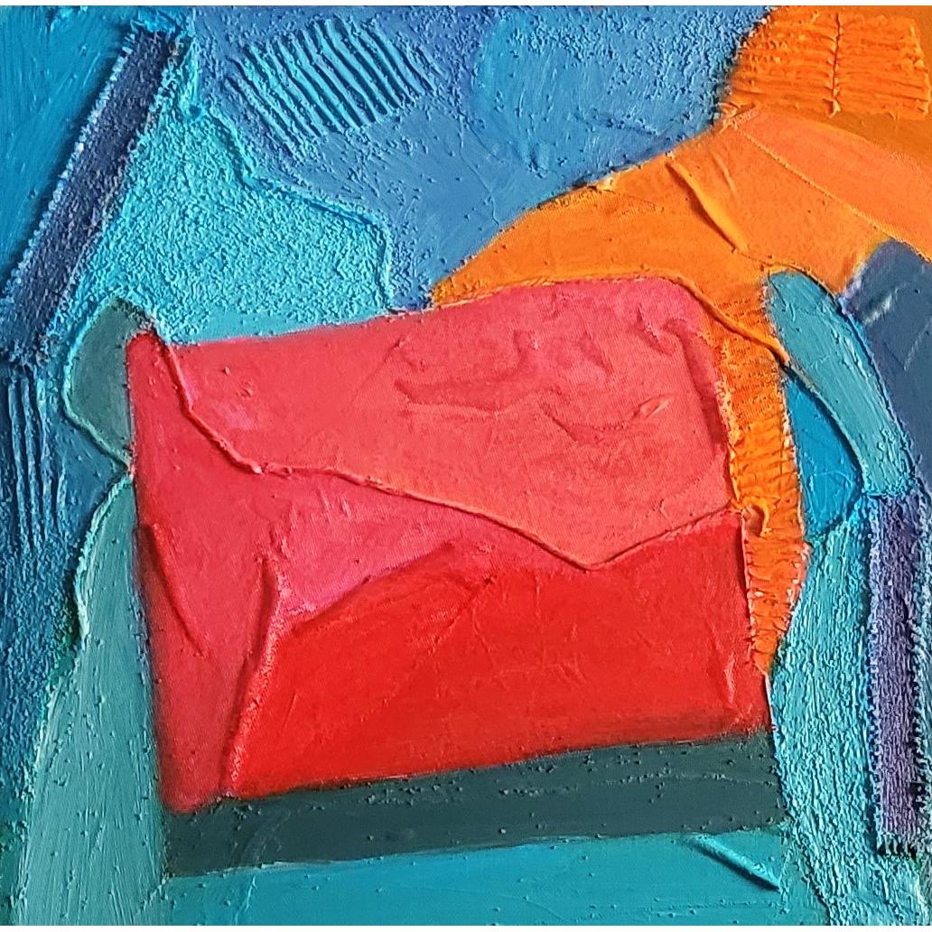 Al centro domina una forma rosso intenso, irregolare e vibrante, che sembra fungere da fulcro emotivo dell’intera composizione. Questo rosso, caldo e pulsante, è circondato da una gamma di blu e turchesi che raffreddano e bilanciano l’insieme, creando un dialogo continuo tra opposti cromatici. L’inserimento dell’arancione, soprattutto nella parte superiore, introduce una nota di movimento e di contrasto ulteriore, come se una forza esterna stesse entrando o attraversando lo spazio pittorico.