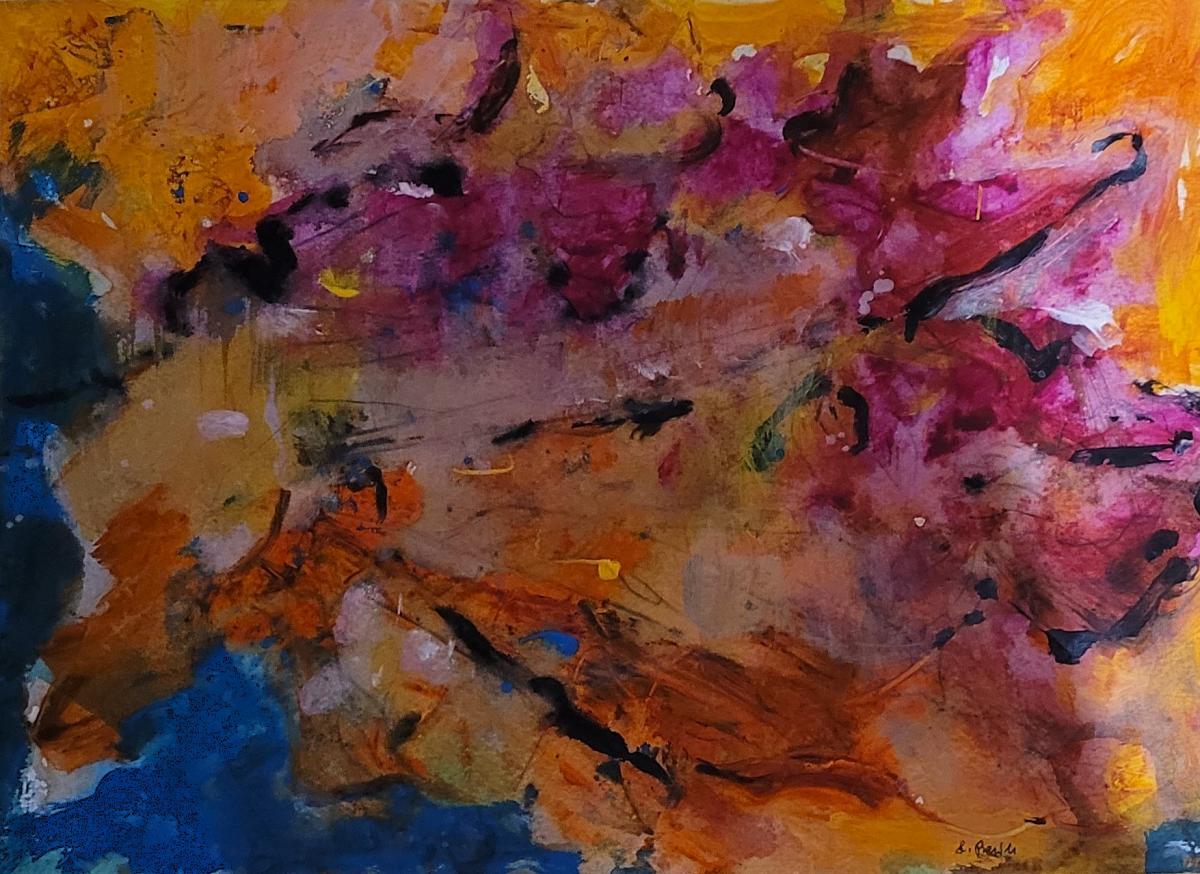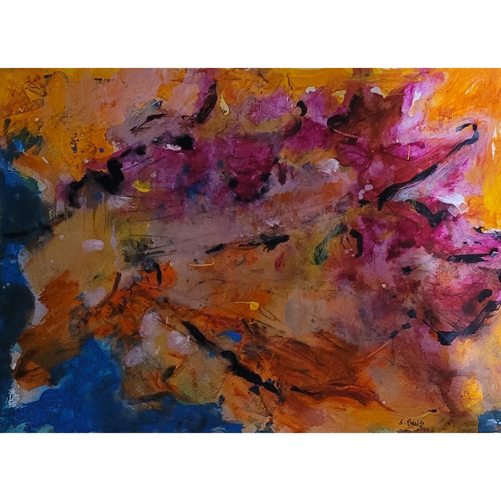 Quest’opera si impone con una forza viscerale, trascinando l’osservatore in un campo emotivo dominato dal rosso, declinato in infinite variazioni che oscillano tra il fuoco, la carne e la ferita. La composizione astratta è densa, stratificata, quasi tumultuosa: i colori sembrano sovrapporsi come sedimenti di emozioni non pacificate, mentre le tracce nere, nervose e irregolari, attraversano la superficie come segni di tensione o fratture interiori.