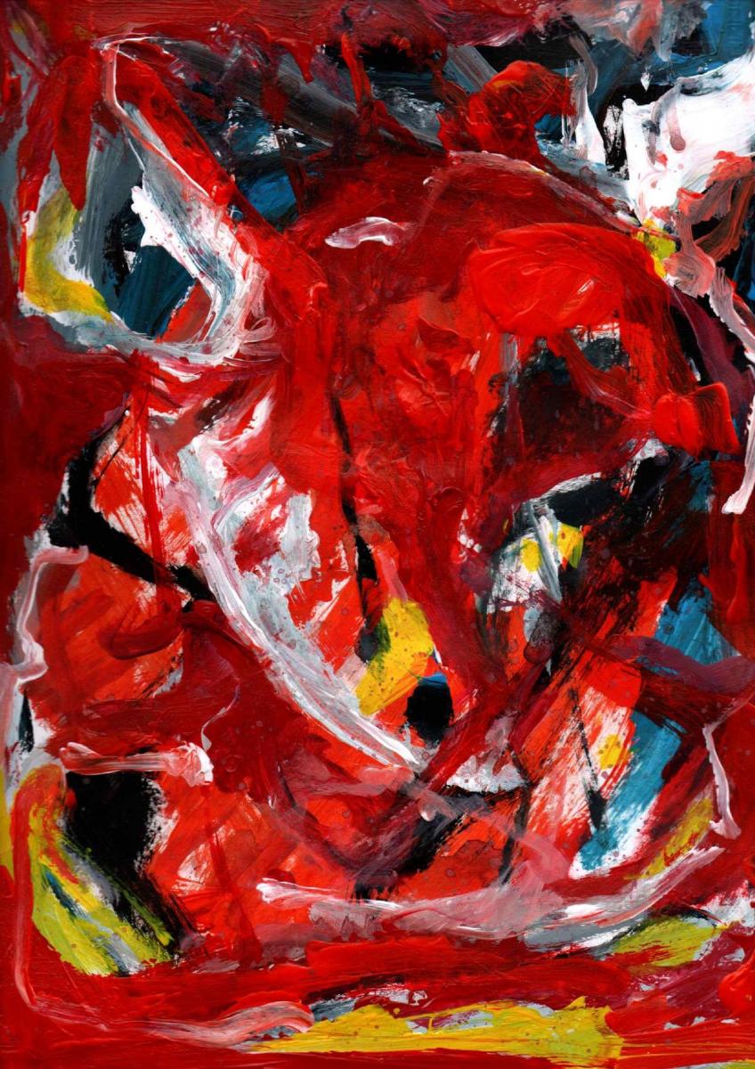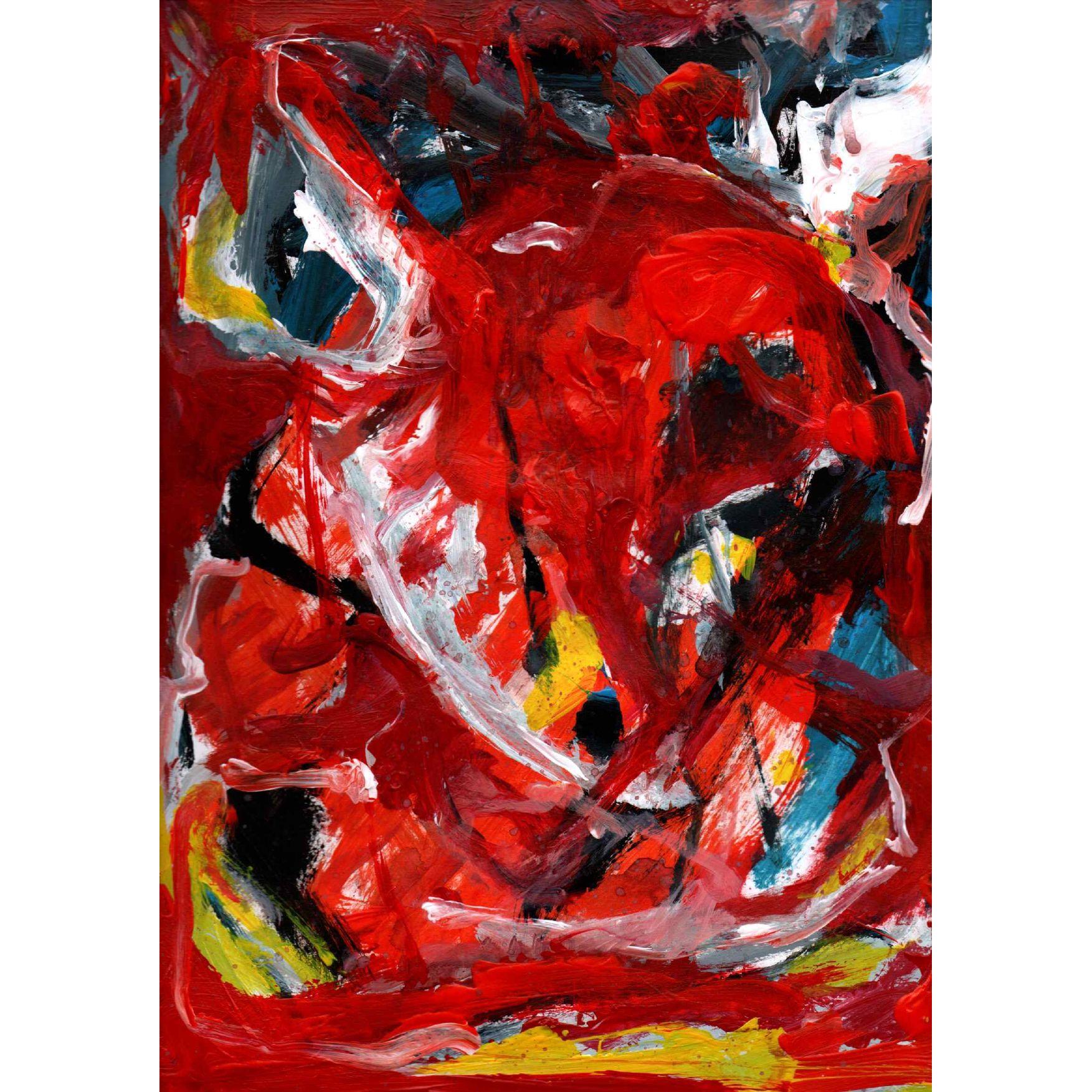 Quest’opera si impone allo sguardo con una forza viscerale, quasi tellurica. Il dominio del rosso, declinato in una molteplicità di tonalità che vanno dal cremisi acceso al carminio più cupo, diventa il vero protagonista emotivo della composizione. Non è un rosso uniforme o decorativo: è un colore che pulsa, che ferisce e avvolge, evocando tensioni interiori, conflitti, passione e urgenza.