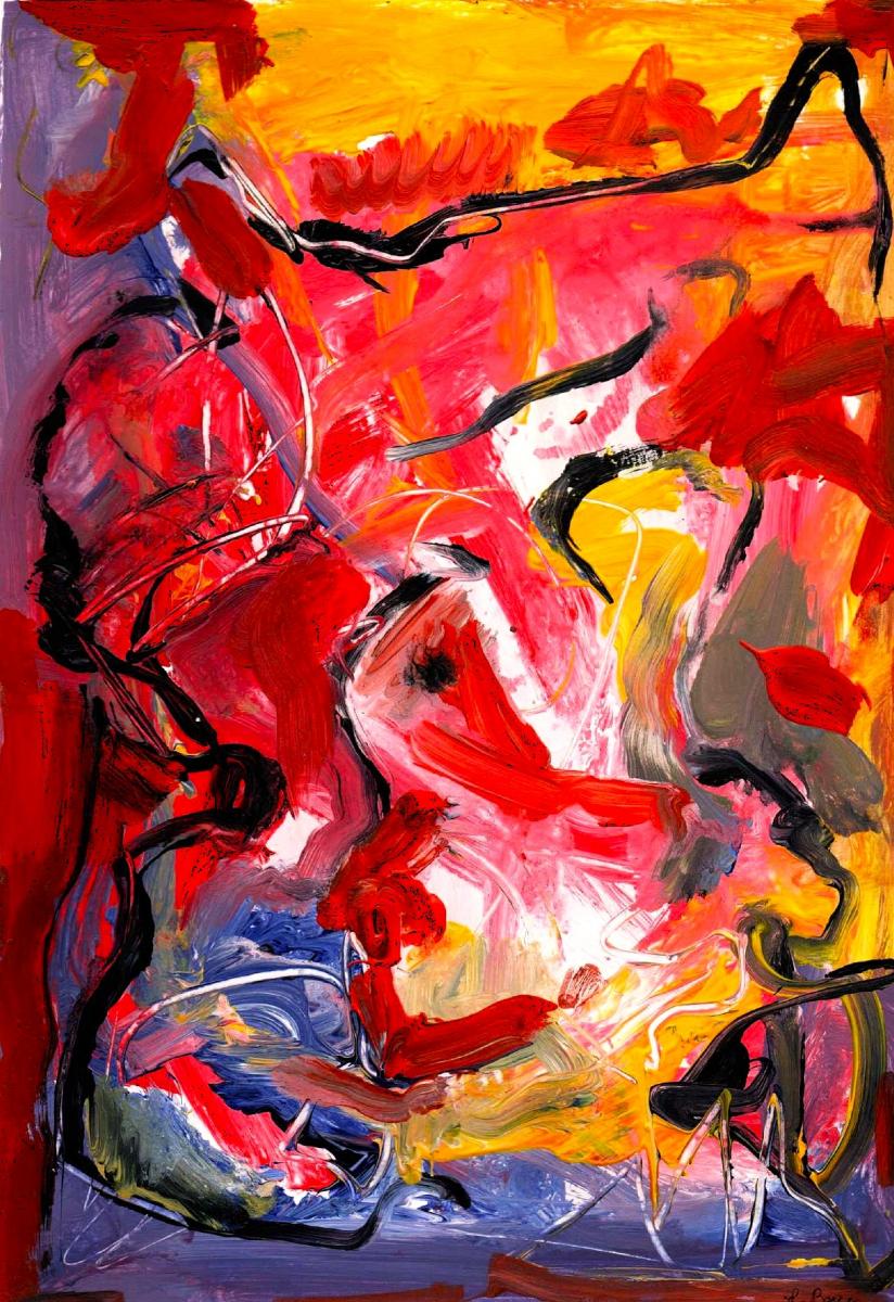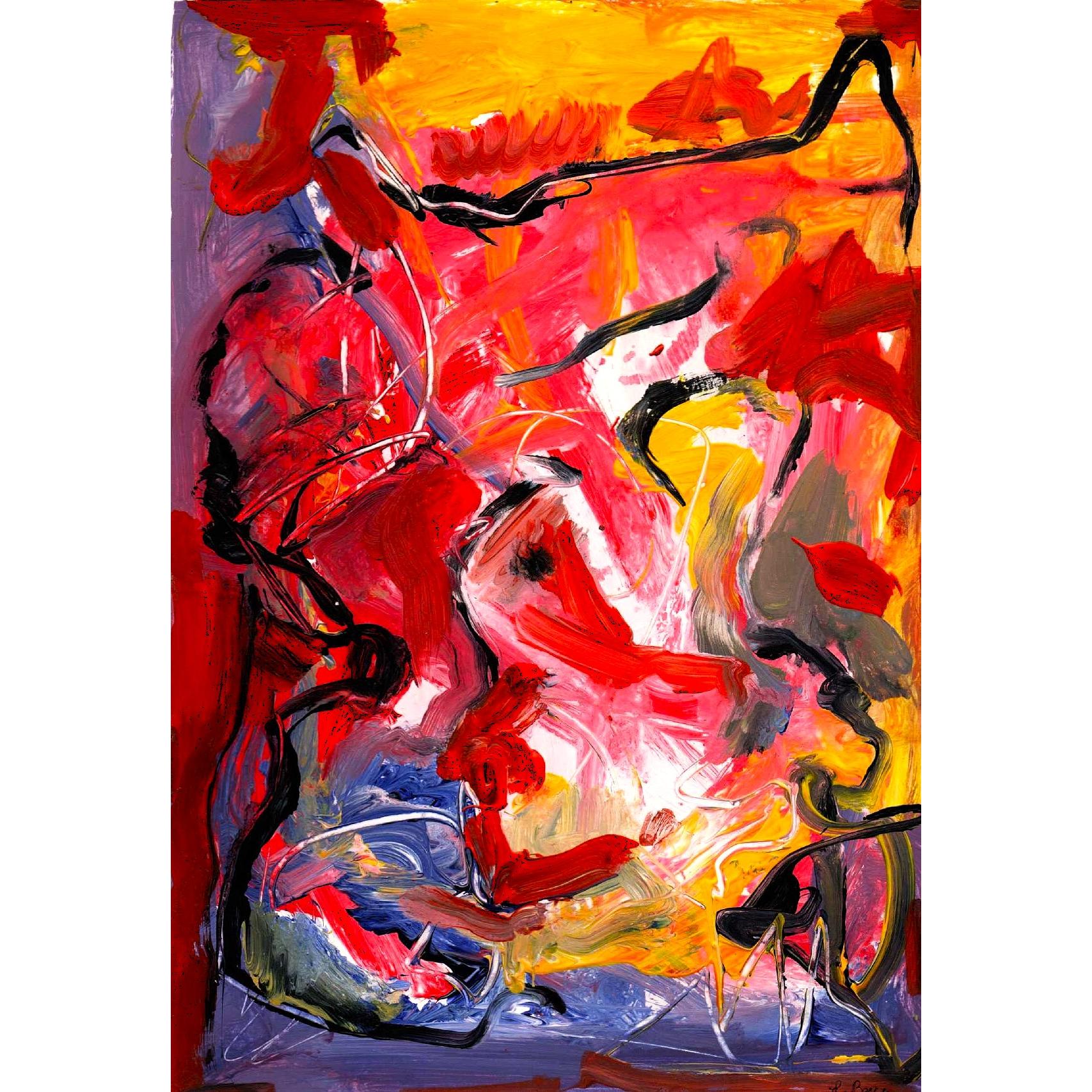 Quest’opera si impone allo sguardo con un’energia viscerale e quasi tumultuosa, affidata a una pittura gestuale che privilegia l’impatto emotivo rispetto alla rappresentazione figurativa. Il colore è il vero protagonista: rossi incandescenti, gialli solari e aranci infuocati dominano la superficie, contrastati da improvvise incursioni di nero, viola e blu che agiscono come linee di tensione e di contenimento.