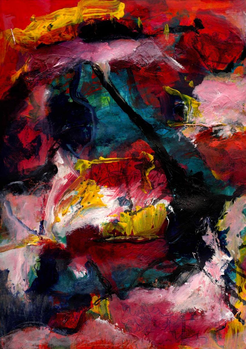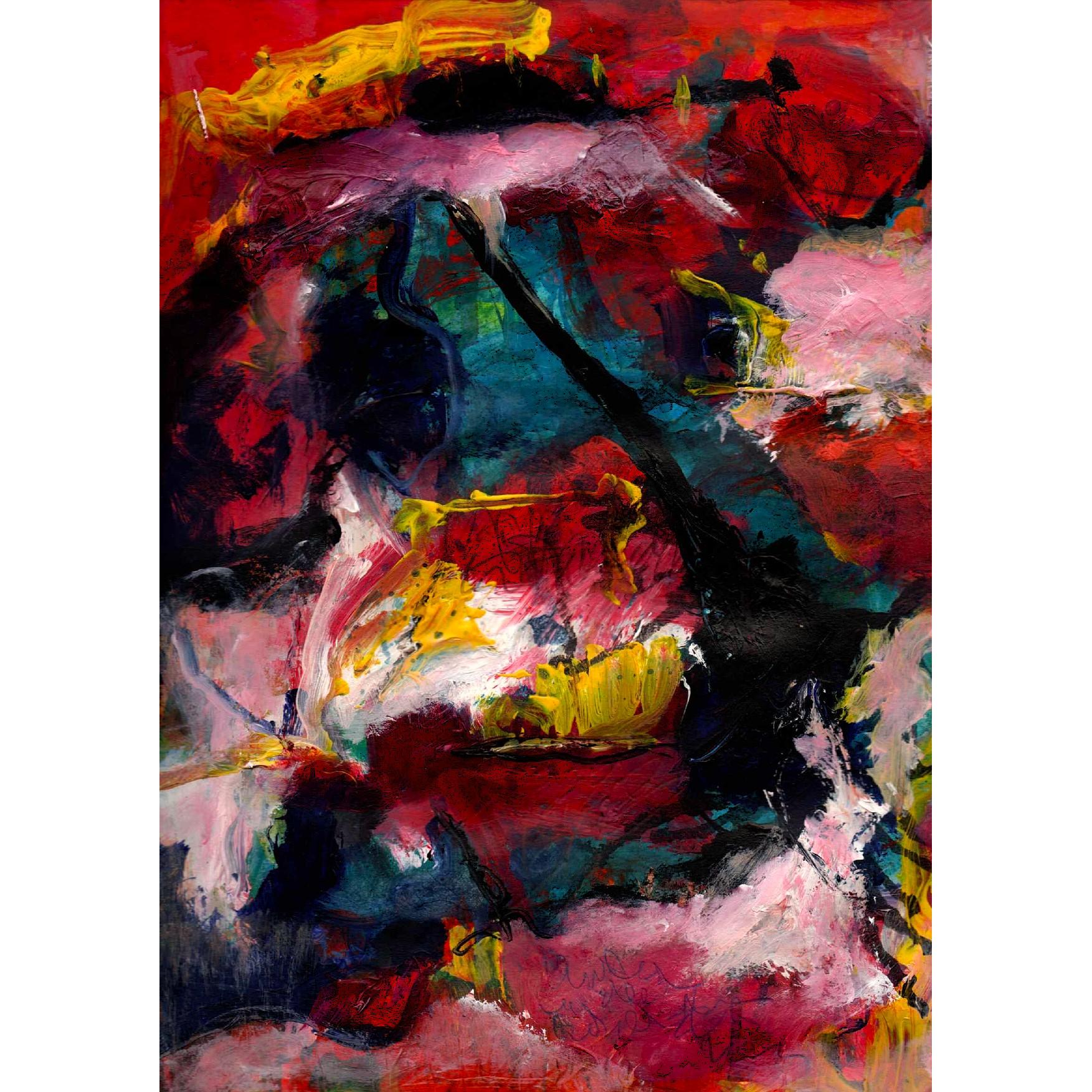 Quest’opera si impone allo sguardo come un campo di tensioni emotive, un territorio instabile in cui il colore diventa gesto e il gesto diventa racconto. La composizione astratta è dominata da una tavolozza intensa e contrastata: i rossi incandescenti e i gialli acidi dialogano con profondi blu petrolio e neri materici, creando un equilibrio precario tra impulso vitale e zone d’ombra.