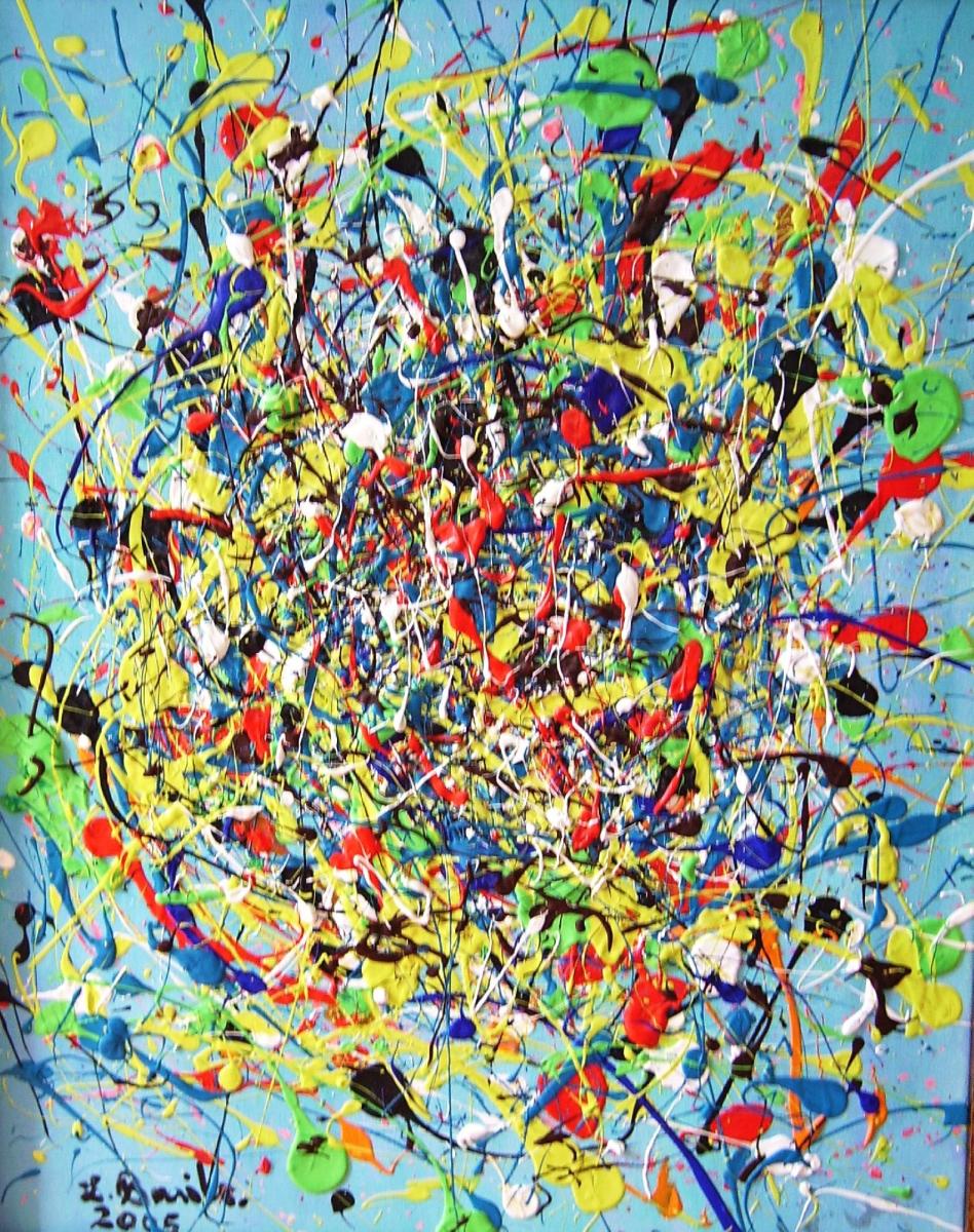 Quest’opera si presenta come una esplosione vitale di energia e movimento, inscritta pienamente nella tradizione dell’action painting e del gesto informale. La superficie è attraversata da un fitto intreccio di colature, schizzi e filamenti cromatici che sembrano registrare il tempo dell’azione, come se la tela fosse il luogo di una danza istintiva e incontrollata.