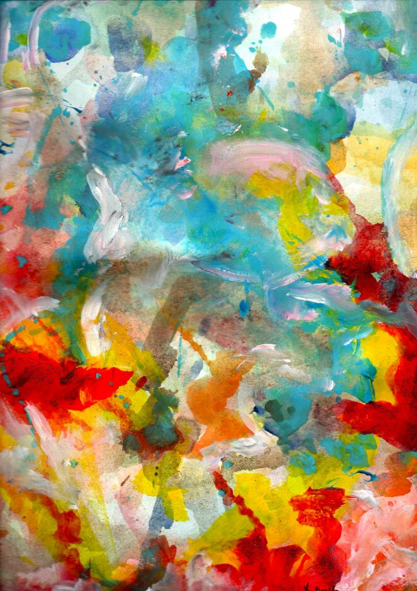 Quest’opera astratta colpisce immediatamente per la sua energia cromatica e per la stratificazione materica che invita a una lettura lenta e sensoriale. Il dialogo tra i toni freddi – soprattutto azzurri e turchesi – e le accensioni calde di rosso, giallo e arancio crea una tensione visiva costante, quasi un alternarsi di quiete e impulso. I colori non sembrano mai statici: si sovrappongono, si contaminano, si rincorrono in un movimento fluido che suggerisce trasformazione continua.