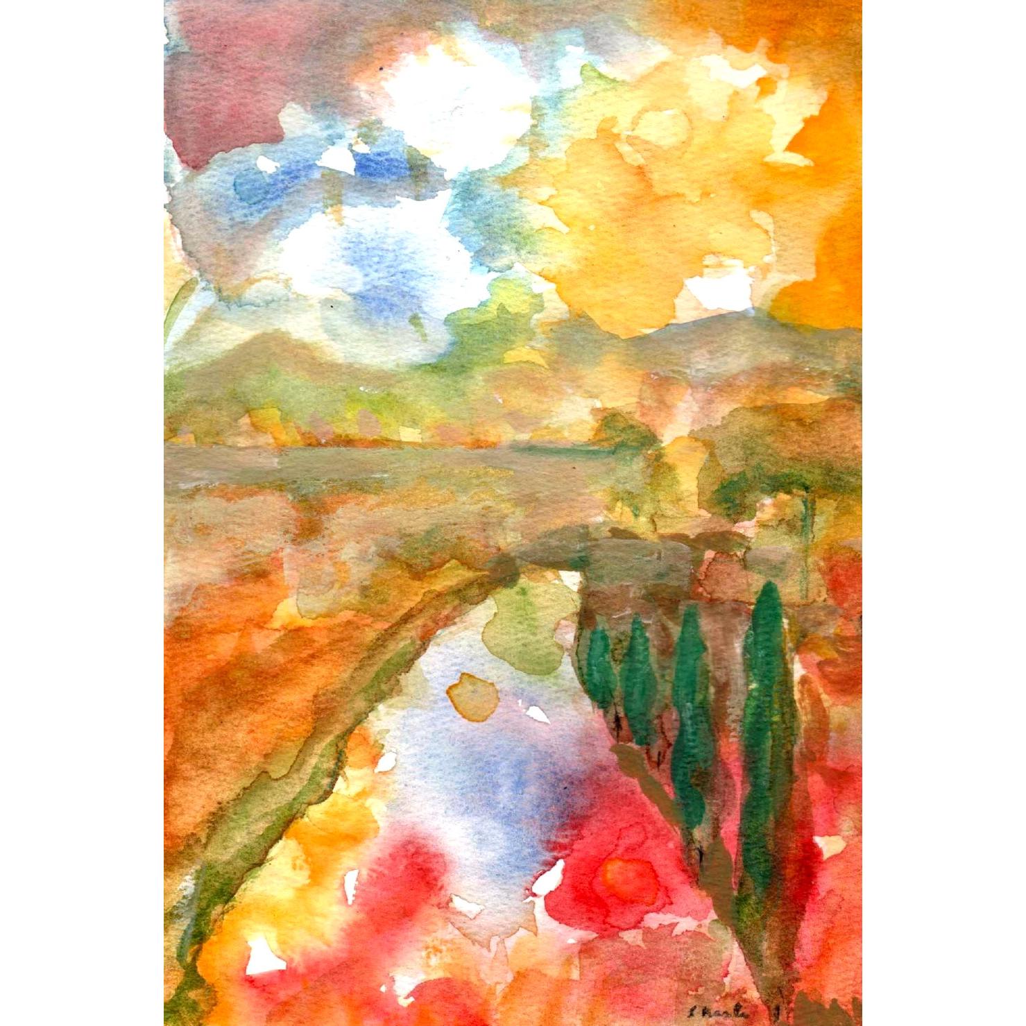 I toni caldi – aranci, ocra, rossi – dominano la scena e trasmettono una sensazione di luce intensa, quasi crepuscolare, mentre le macchie azzurre e verdastre introducono equilibrio e profondità, suggerendo cielo, acqua e vegetazione senza mai descriverli in modo esplicito. Le pennellate sono libere, talvolta irregolari, lasciando che l’acqua guidi il colore in colature e sovrapposizioni spontanee: un segno di controllo consapevole unito all’accettazione del caso, tipica dell’acquerello più espressivo.