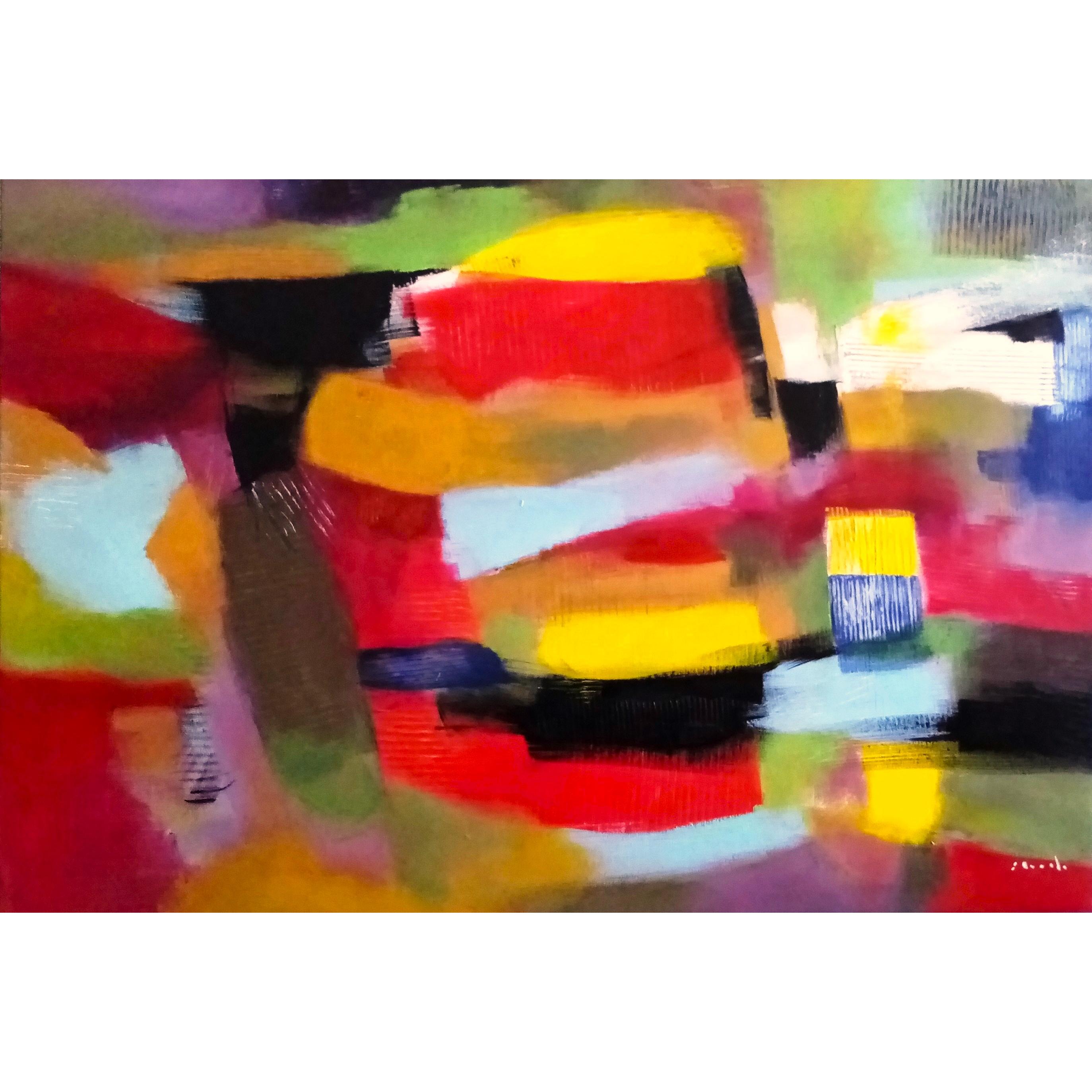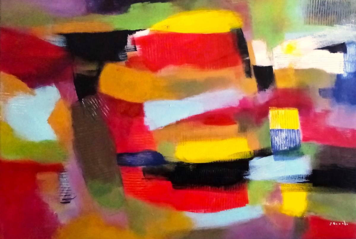 Quest’opera si presenta come una composizione astratta di forte impatto visivo, costruita su una stratificazione dinamica di campiture cromatiche e gesti pittorici decisi. Il colore è il vero protagonista: rossi intensi, gialli accesi, neri profondi e azzurri lattiginosi si alternano e si sovrappongono creando un ritmo irregolare, quasi sincopato, che guida lo sguardo senza mai offrirgli un punto di quiete definitivo.