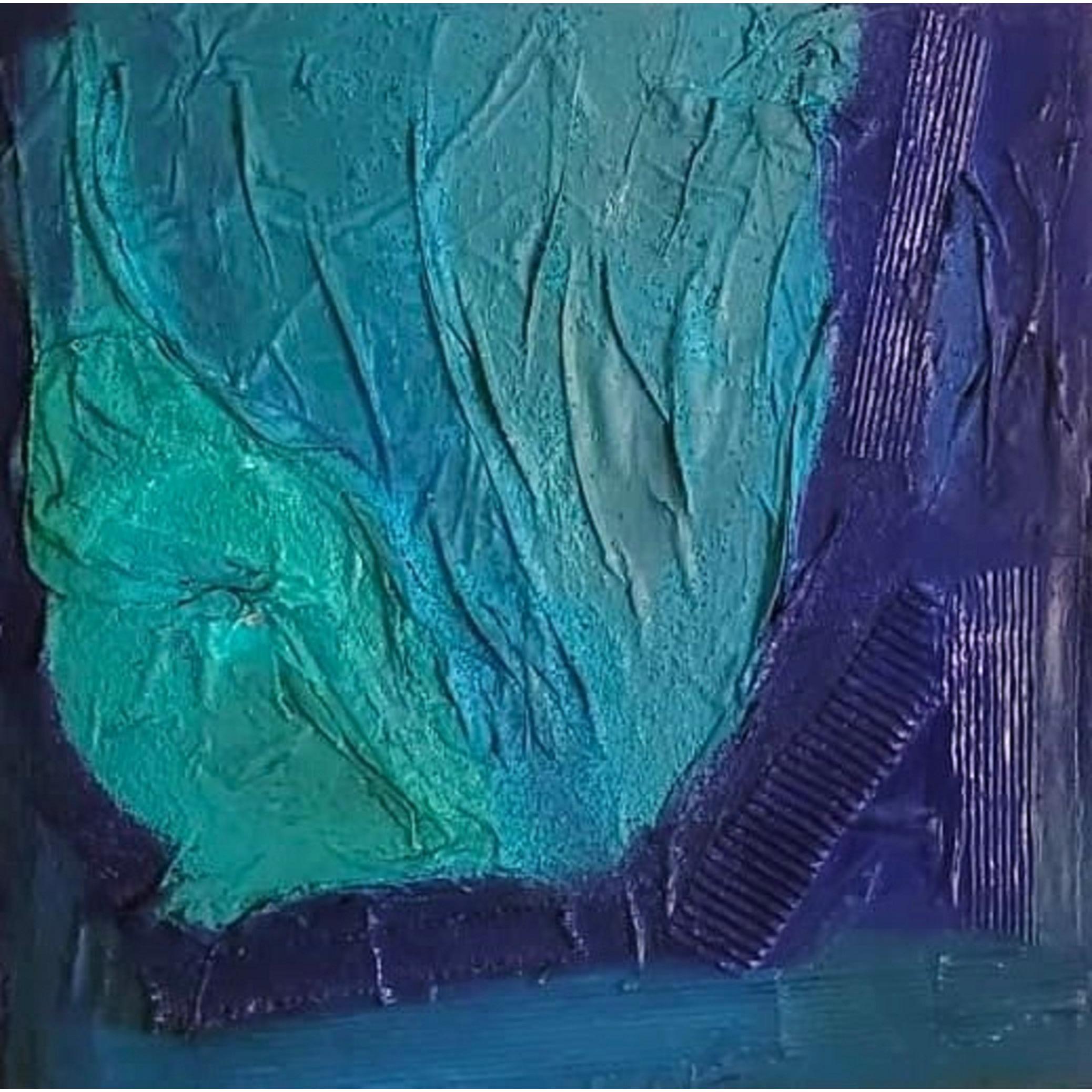Quest’opera si colloca nell’ambito dell’astrazione materica, dove il colore e la superficie diventano i veri protagonisti del discorso visivo. La composizione è dominata da una gamma cromatica fredda — turchesi, verdi acquosi e blu profondi — che evoca immediatamente un paesaggio interiore più che uno spazio reale: una sorta di immersione, quasi organica, in una materia viva e pulsante.