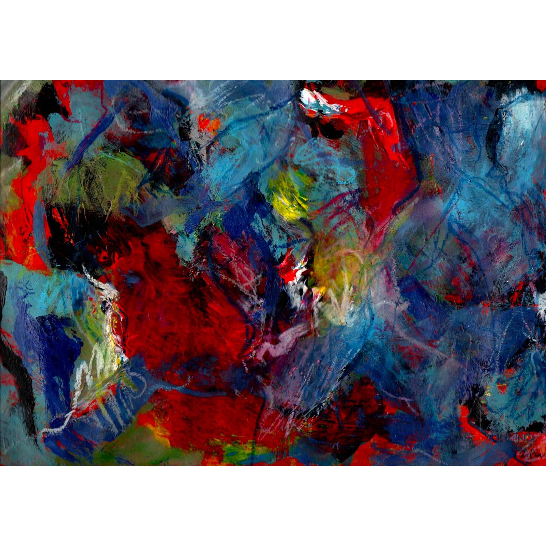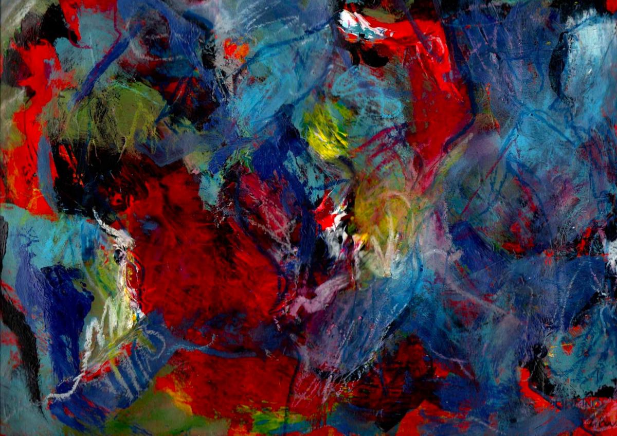 Il colore è il vero protagonista: il rosso, violento e pulsante, emerge come forza primaria, evocando energia, conflitto, forse persino una dimensione viscerale o drammatica. A contrastarlo, i blu e gli azzurri creano zone di apparente raffreddamento emotivo, ma senza mai offrire una reale tregua; al contrario, essi sembrano inglobati nella stessa dinamica turbolenta, contaminati da verdi acidi, neri profondi e improvvise accensioni di giallo. Questa dialettica cromatica genera un equilibrio instabile, che tiene l’opera costantemente “in tensione”.