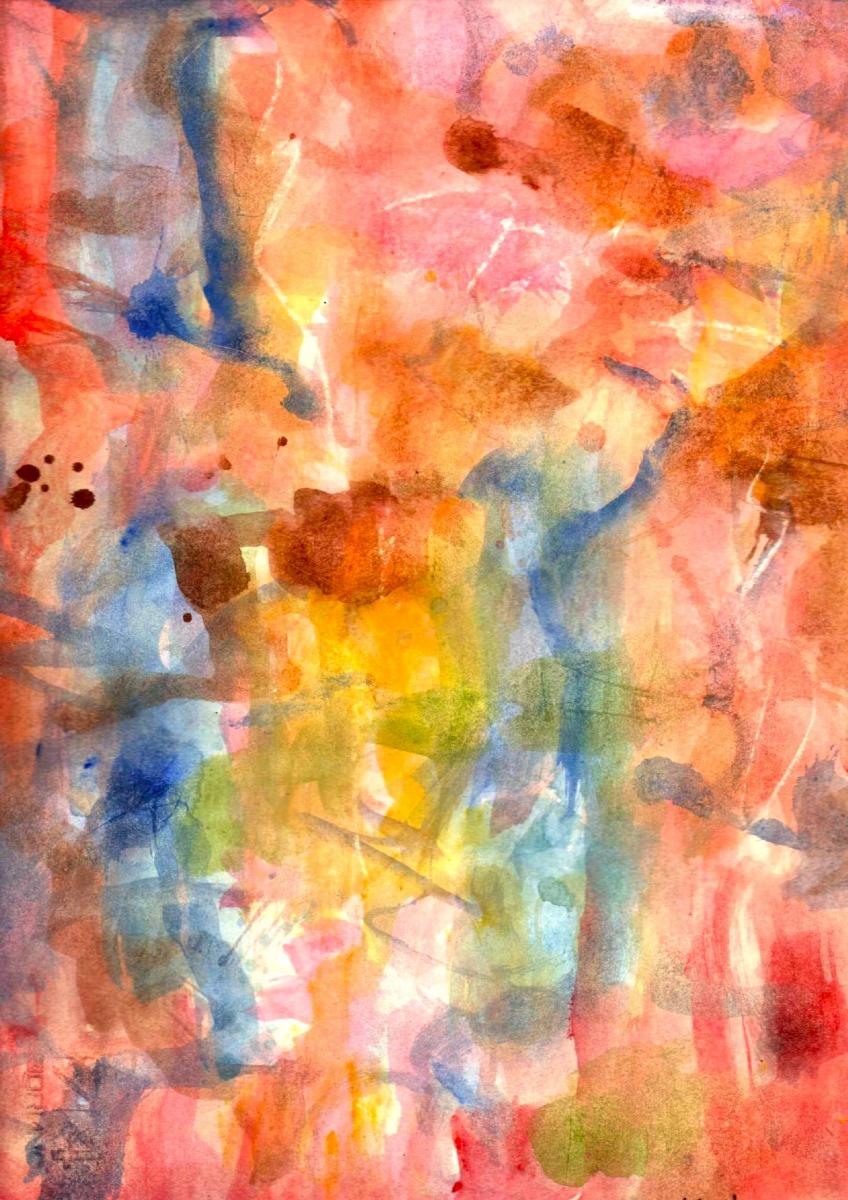 La palette cromatica è dominata da toni caldi — aranci, rossi, rosa e gialli — bilanciati da incursioni di blu e verdi che introducono un ritmo visivo e impediscono alla composizione di scivolare nell’uniformità. Questi contrasti non sono netti, ma mediati da passaggi morbidi, acquosi, che richiamano la tecnica dell’acquerello o di una pittura fortemente diluita. Ne risulta una sensazione di movimento diffuso, come se l’immagine fosse in uno stato di continua trasformazione.