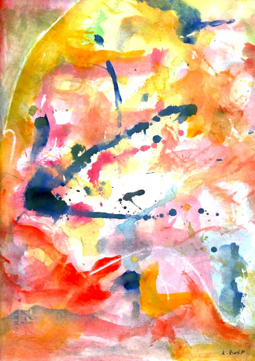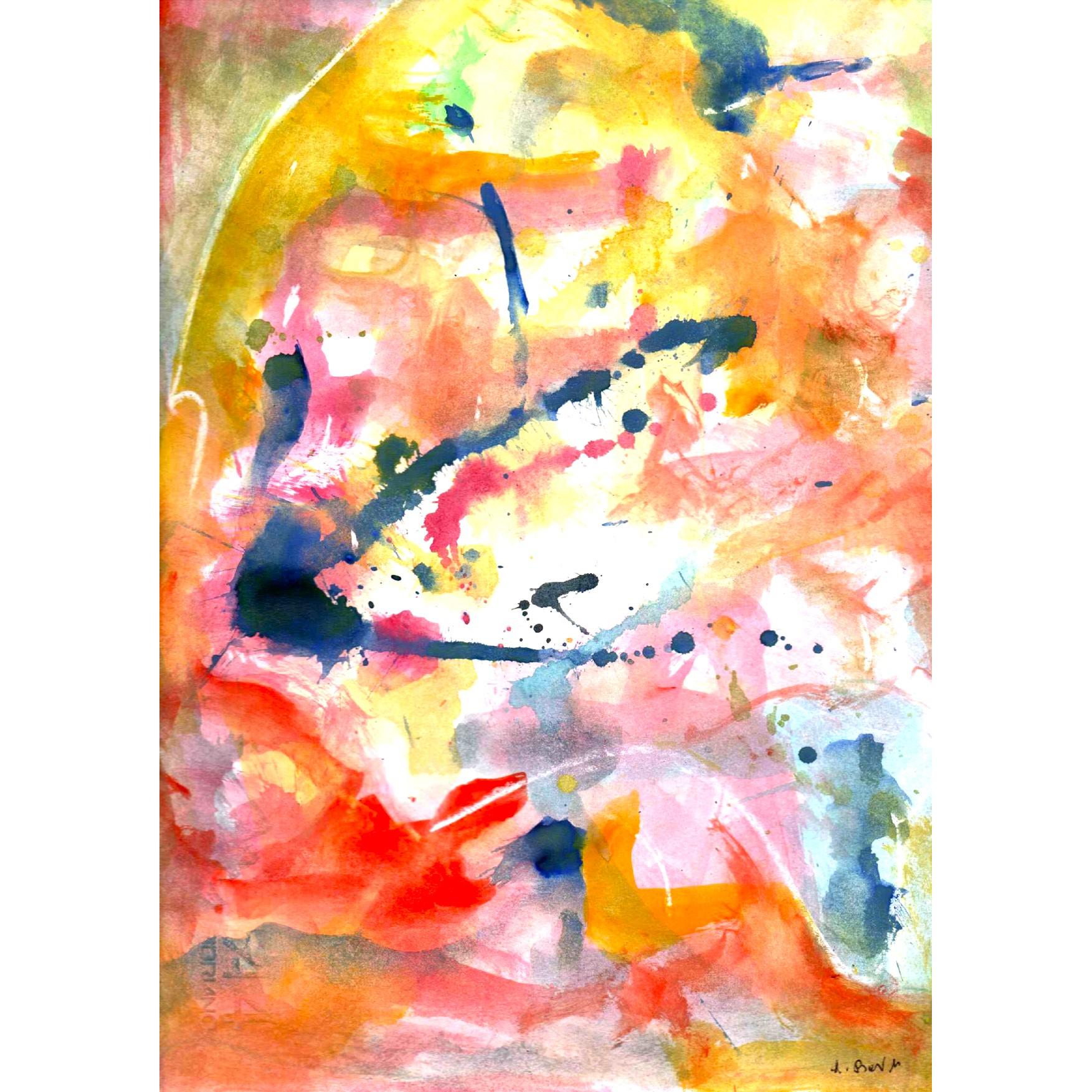 Quest’opera si colloca nel territorio dell’astrazione lirica, dove il gesto pittorico e il colore diventano veicolo primario di senso, più che strumenti di rappresentazione. La superficie è attraversata da una stratificazione fluida di campiture cromatiche che sembrano nascere da un processo di accumulo e cancellazione, tipico dell’acquerello ma spinto qui verso una dimensione più istintiva e quasi performativa.