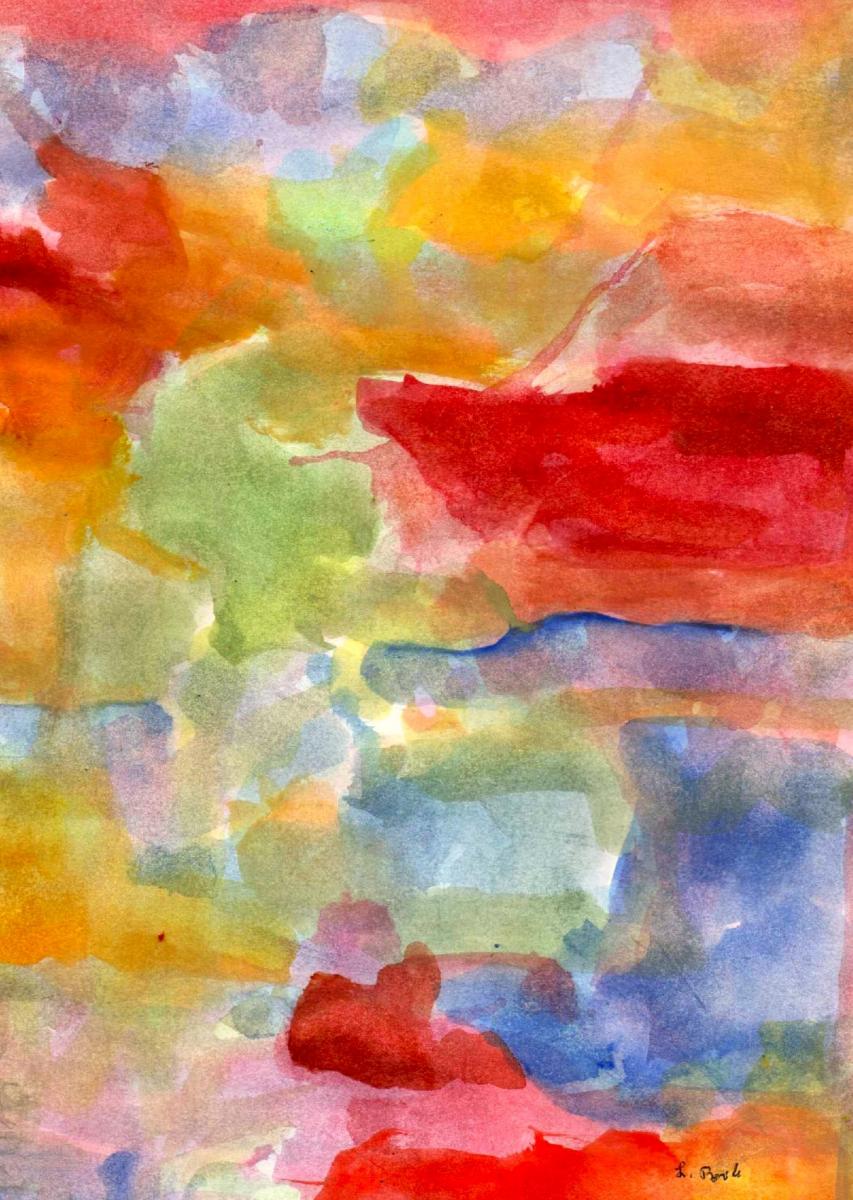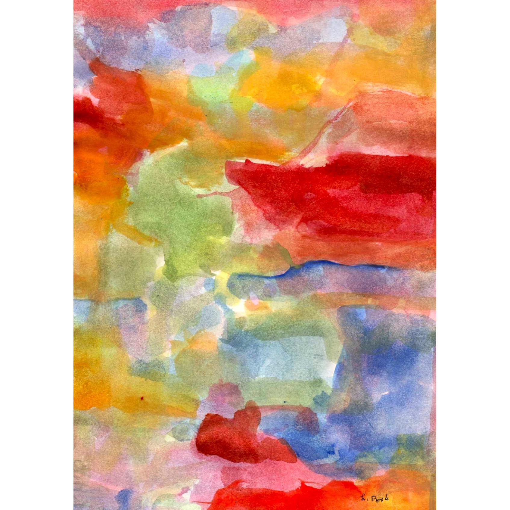 Quest’opera si presenta come una composizione astratta di matrice chiaramente lirica, dove il colore è il vero protagonista e il soggetto viene deliberatamente dissolto in favore di una percezione emotiva. La superficie pittorica è attraversata da campiture cromatiche sovrapposte e trasparenti, tipiche dell’acquerello, che costruiscono un equilibrio fragile ma intenzionale tra caos e armonia.