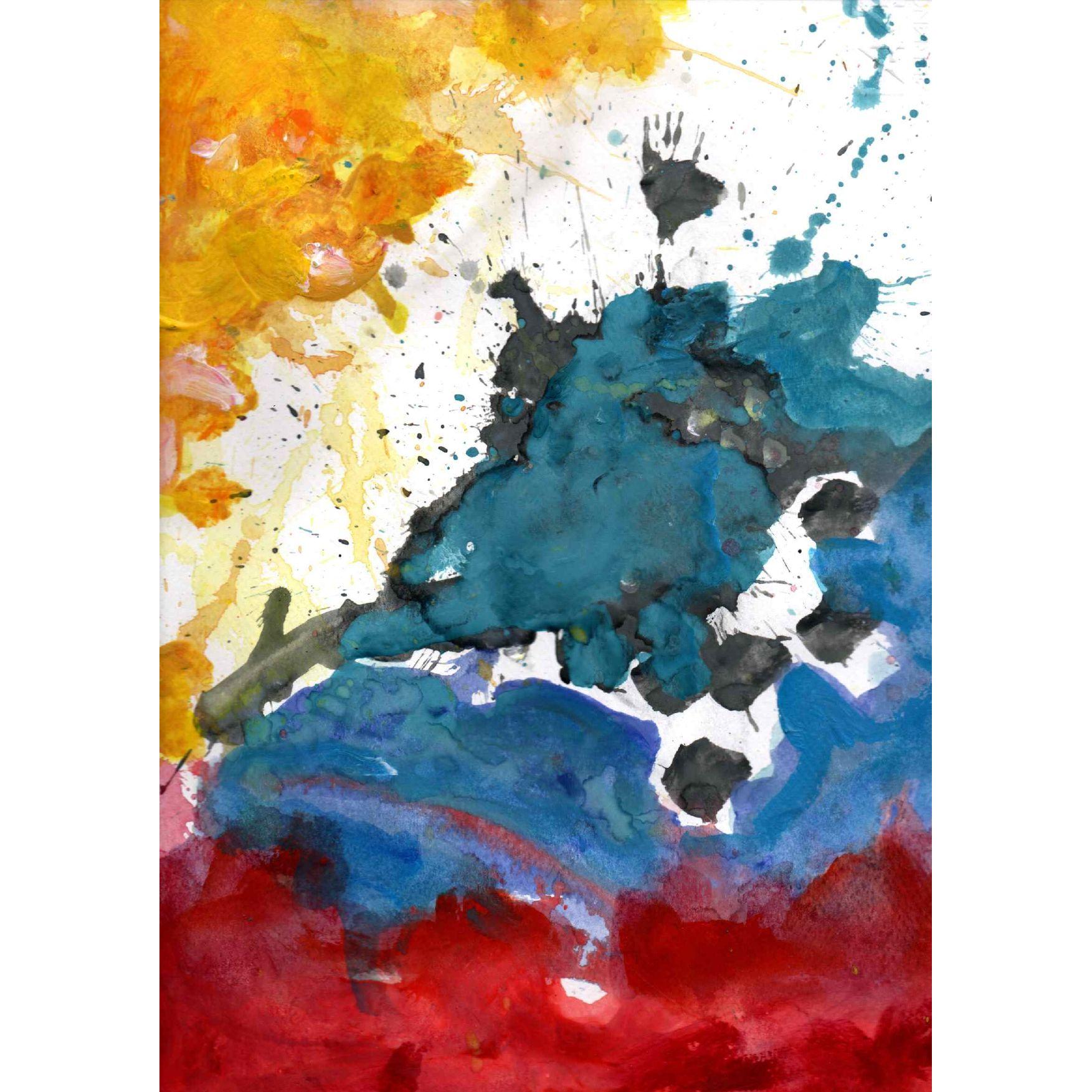 Il contrasto cromatico è uno degli elementi più riusciti: i gialli e gli aranci nella parte superiore evocano una dimensione luminosa, energetica, quasi esplosiva, mentre i blu e i turchesi centrali introducono una zona più densa e meditativa. Il rosso intenso che occupa la fascia inferiore agisce come una base emotiva, suggerendo tensione, profondità o persino una vibrazione drammatica. Questa progressione verticale dei colori può essere letta come un passaggio simbolico: dalla luce alla materia, dall’aria all’emozione viscerale.