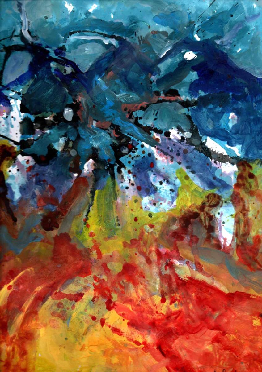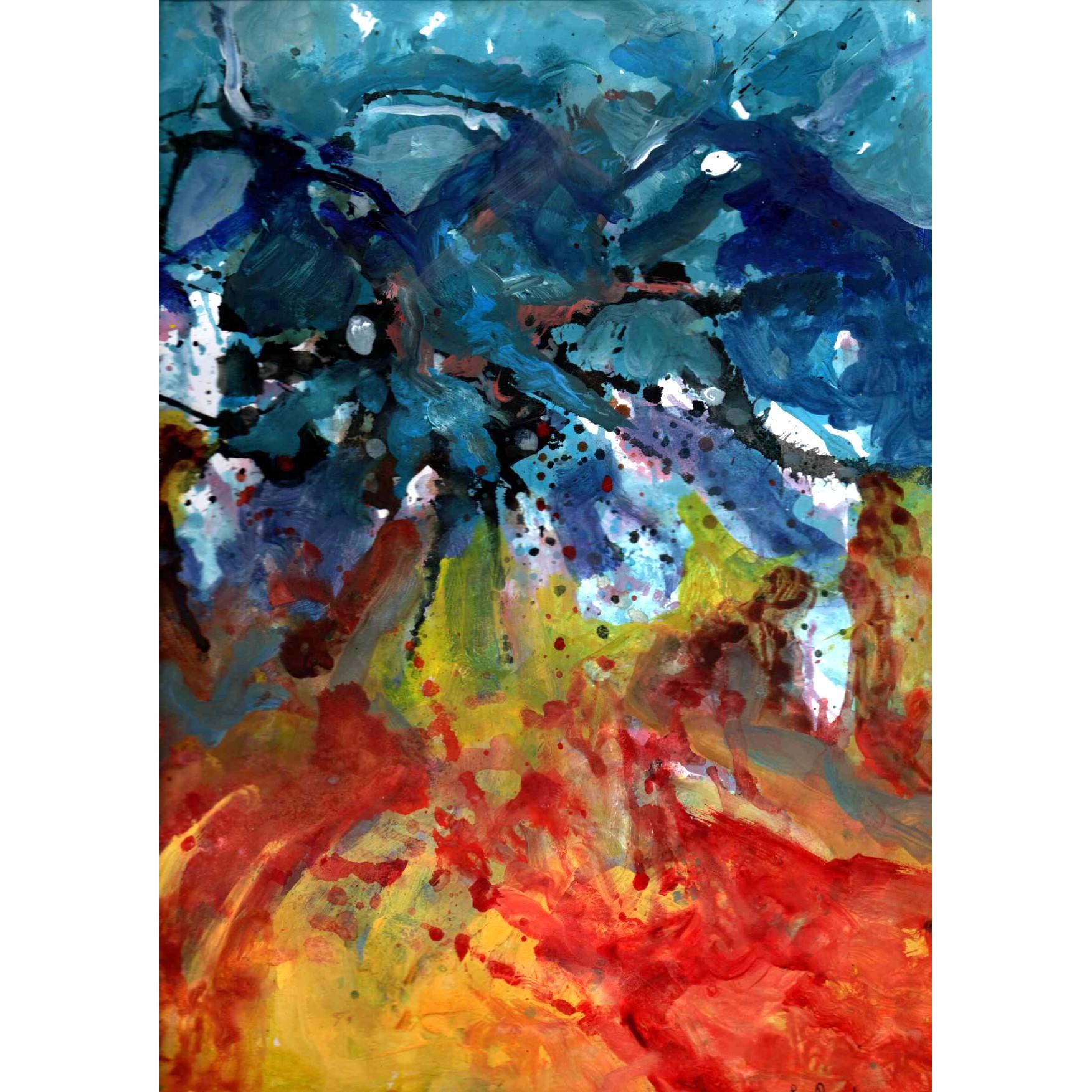 Quest’opera si impone allo sguardo come un campo di forze in costante collisione, un paesaggio emotivo più che visivo, dove il colore diventa linguaggio primario e il gesto pittorico assume una valenza quasi fisica. La composizione è dominata da una frattura cromatica netta: nella parte superiore prevalgono blu profondi e turchesi torbidi, attraversati da segni scuri e stratificazioni dense, mentre nella zona inferiore esplodono rossi incandescenti, gialli accesi e aranci, evocando calore, combustione, materia viva.