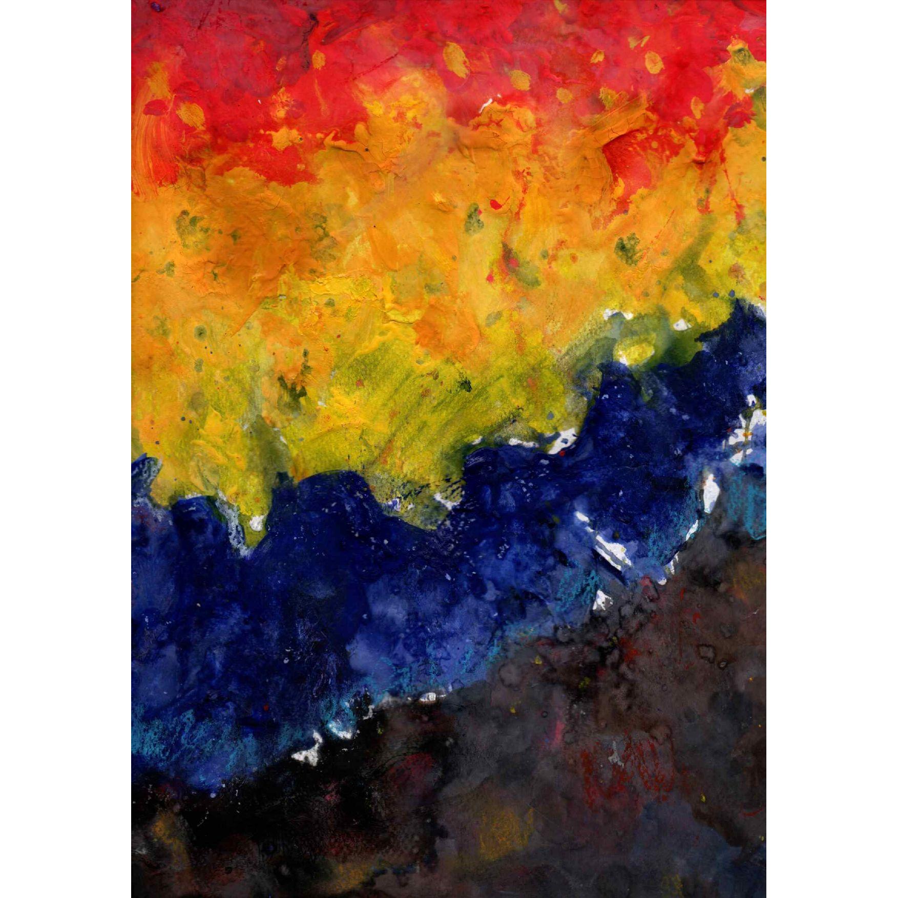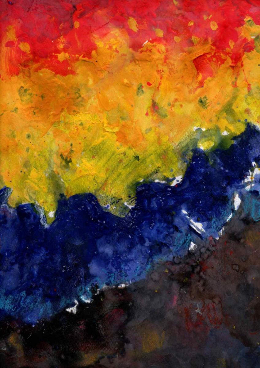 Quest’opera si presenta come una potente stratificazione emotiva, più che come una semplice composizione cromatica. Il colore è il vero protagonista: il rosso e l’arancio nella parte superiore esplodono come una massa incandescente, quasi vulcanica, evocando energia primordiale, tensione, forse persino un senso di pericolo o di nascita. Non sono colori stesi con controllo geometrico, ma lasciati vibrare, colare, mescolarsi: c’è un gesto fisico, istintivo, che si percepisce chiaramente.