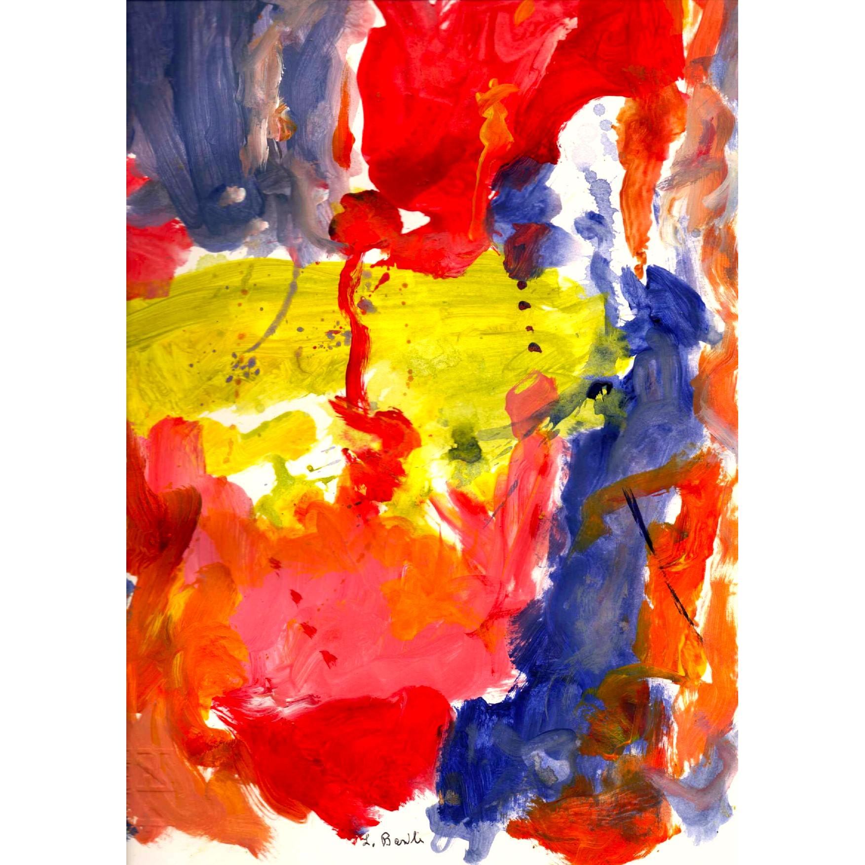 Quest’opera si presenta come una composizione astratta di forte impatto emotivo, costruita attraverso una gestualità pittorica libera e istintiva. Il colore è il vero protagonista: campiture accese di rosso, giallo e blu si scontrano e si intrecciano, creando un campo visivo dinamico, quasi in costante movimento. Il rosso, dominante e pulsante, sembra veicolare un’energia primaria, vitale, mentre il giallo centrale funge da zona di tensione e di luce, una sorta di epicentro emotivo attorno al quale ruota l’intera composizione.