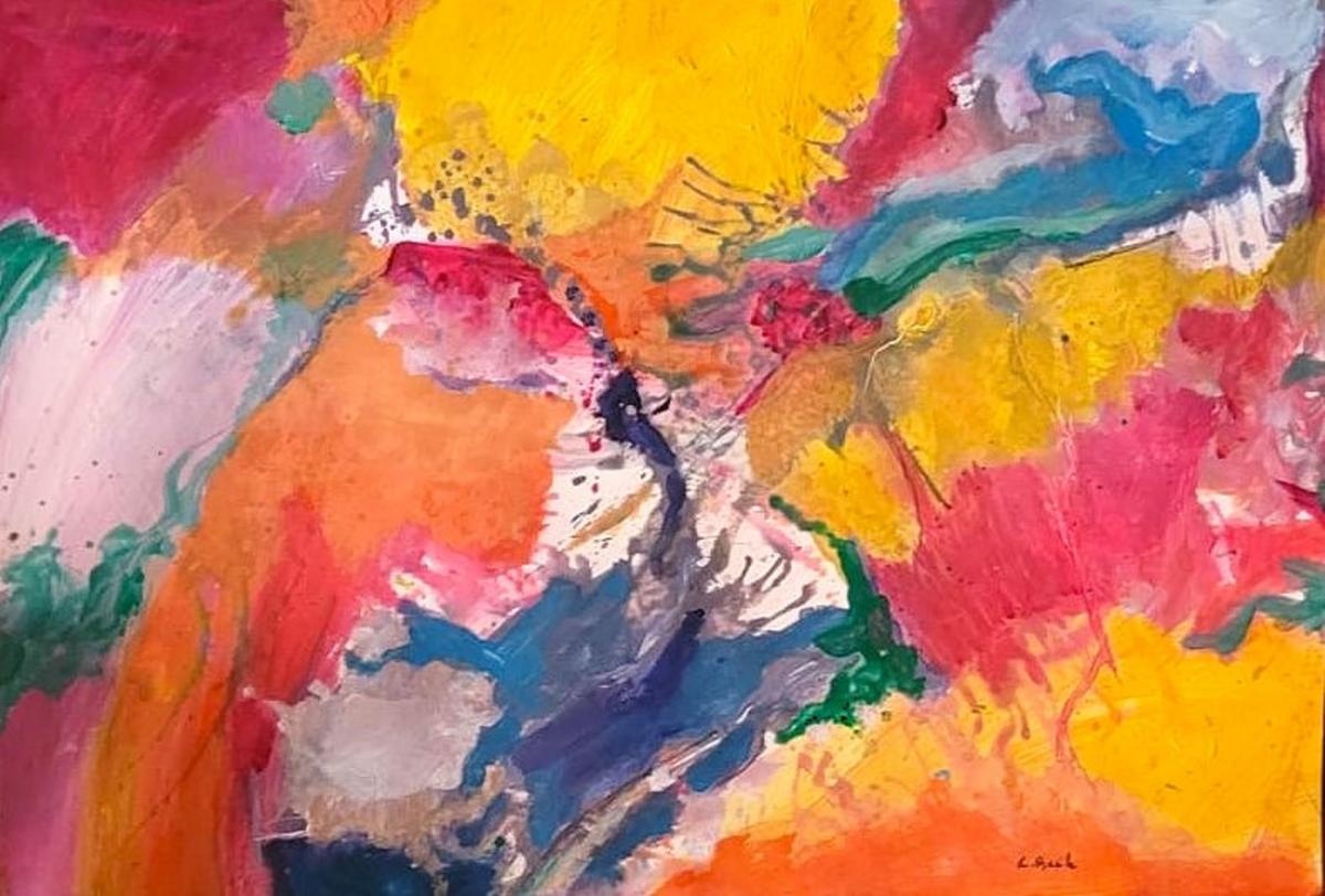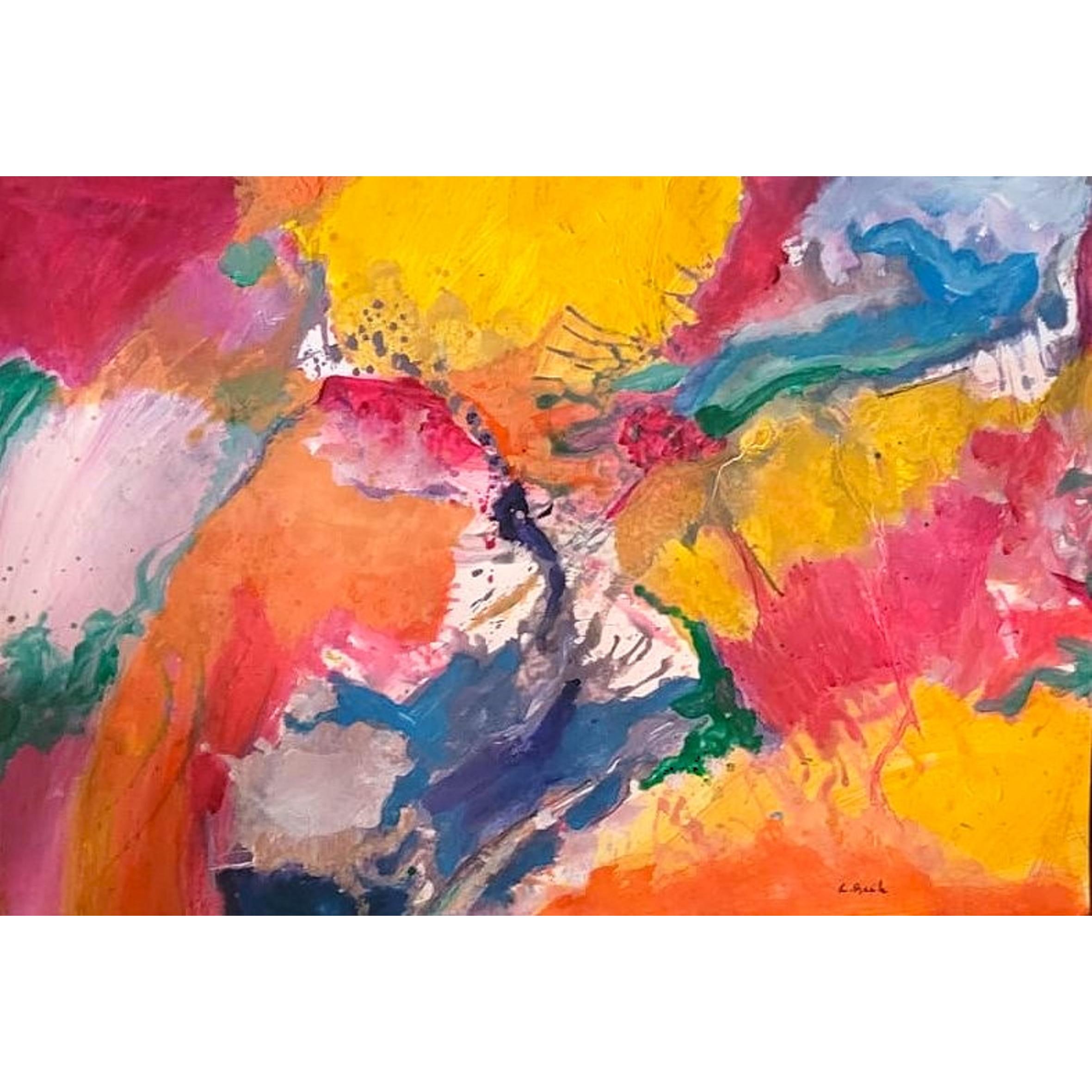 Quest’opera si presenta come un’esplosione cromatica governata più dall’istinto che dalla forma, inscrivendosi con decisione nel solco dell’astrazione gestuale. Il colore non è mai semplice riempimento: è materia viva, stratificata, a tratti violenta, a tratti sorprendentemente lirica. Gialli incandescenti, rossi carnali e azzurri fluidi si scontrano e si intrecciano, creando un campo visivo in costante tensione.