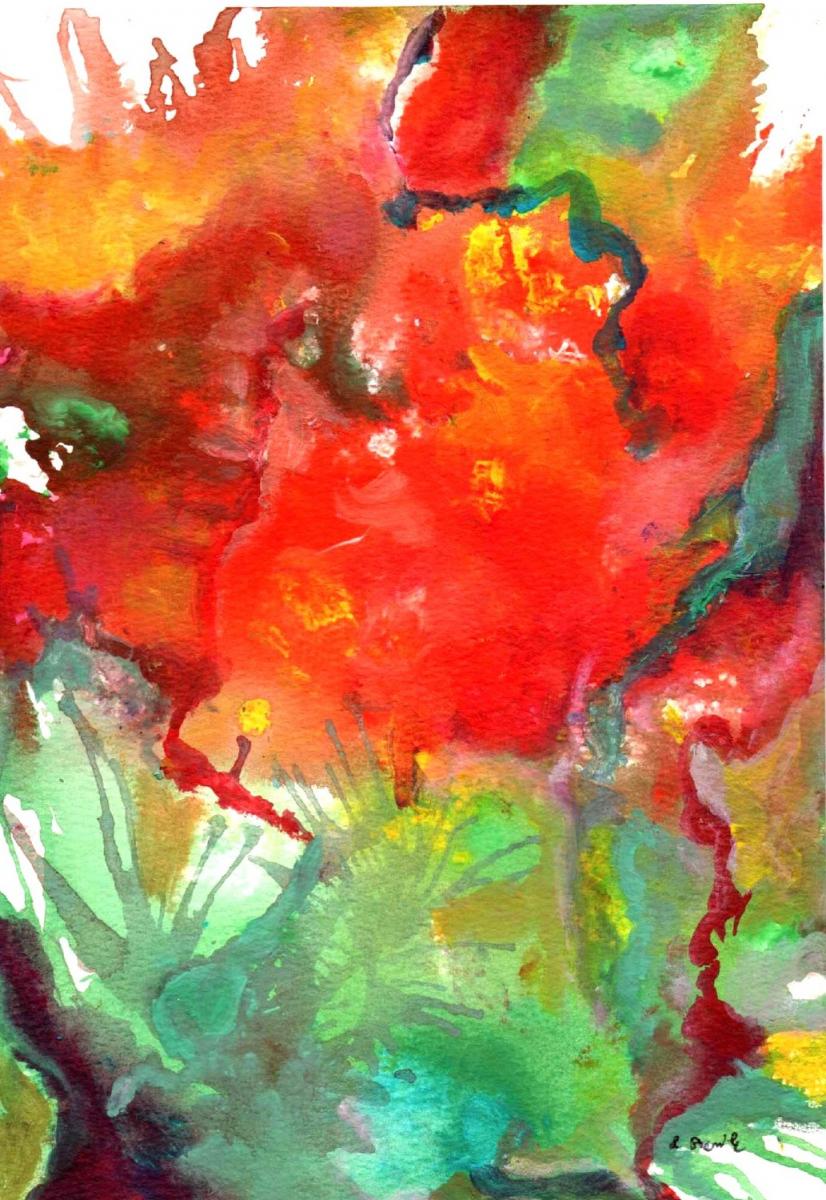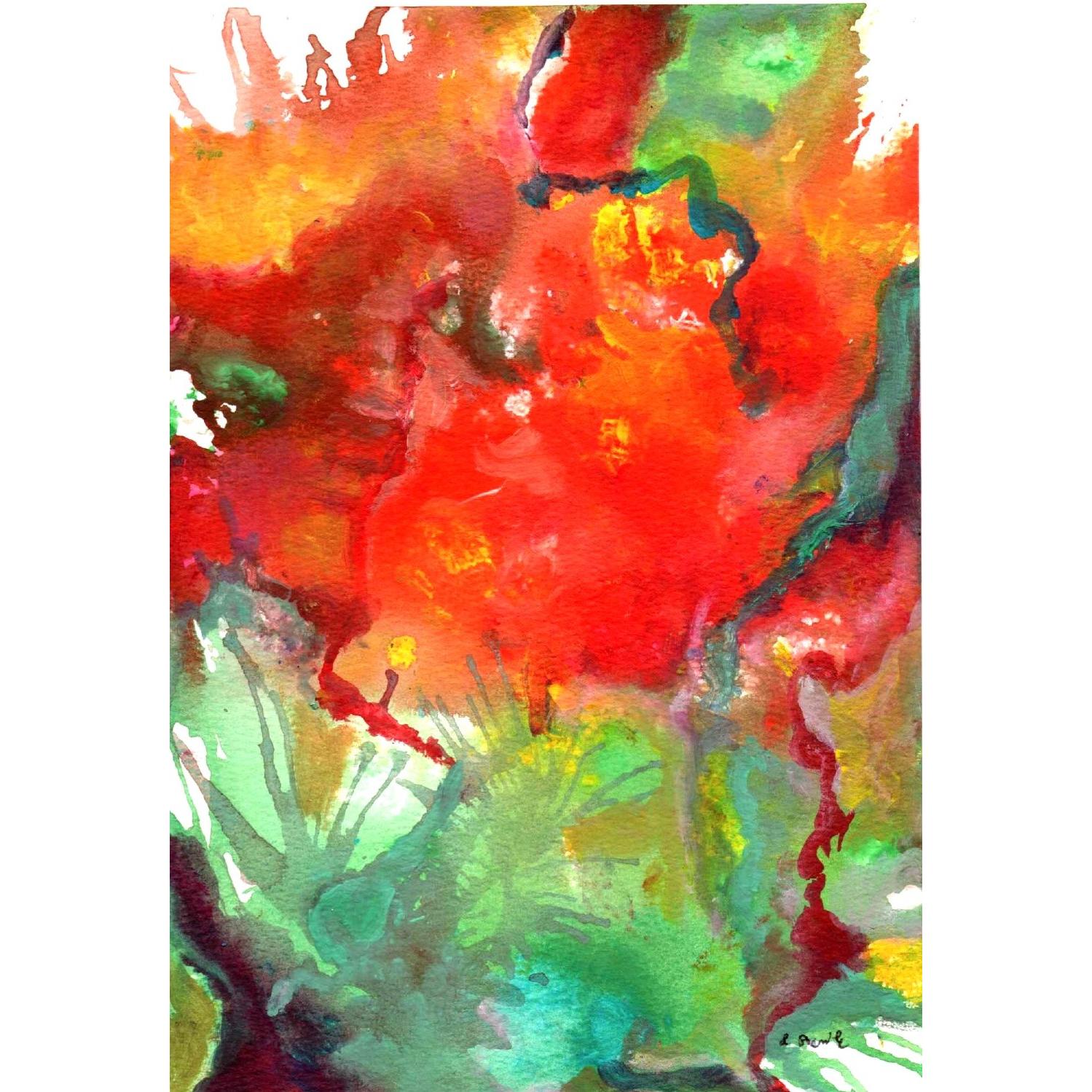 Quest’opera si muove con decisione nel territorio dell’astrazione gestuale, dove il colore non descrive ma agisce. La composizione è dominata da un rosso incandescente, quasi carnale, che occupa il centro come un campo emotivo in tensione, attraversato e talvolta ferito da colature verdi, gialle e blu. Il rosso non è solo colore: è impulso, urgenza, materia viva.