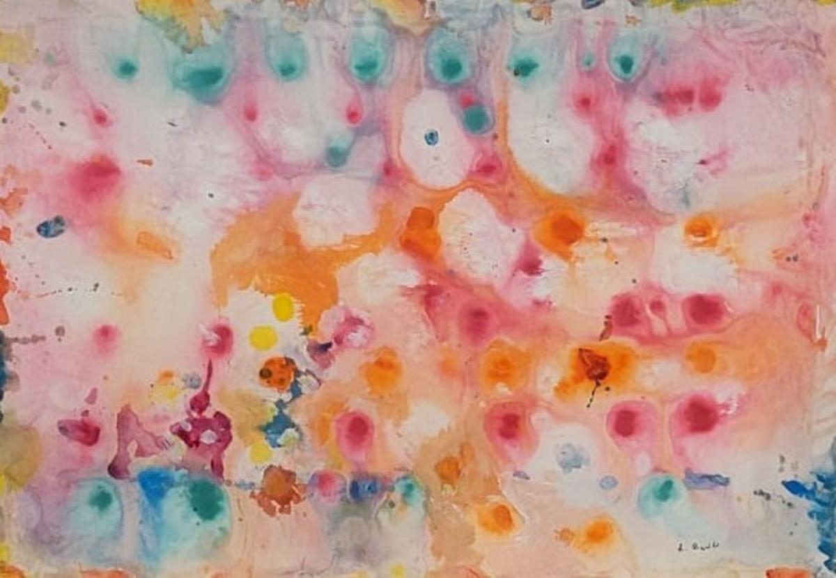 Quest’opera si presenta come una vibrazione cromatica allo stato nascente, un campo emotivo più che uno spazio figurativo. La superficie è attraversata da velature acquose, dove rosa, arancio e turchese si espandono e si dissolvono con la leggerezza di una memoria che affiora. Non c’è un centro gerarchico: lo sguardo è invitato a muoversi liberamente, seguendo la punteggiatura irregolare delle macchie, delle gocce, delle fioriture di colore che sembrano generarsi spontaneamente.
