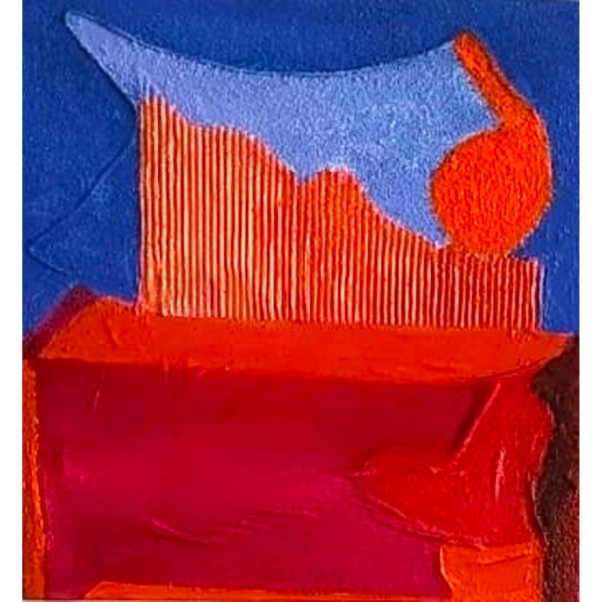 L’opera presentata si impone per l’immediatezza cromatica e per una costruzione formale che oscilla tra figurazione e astrazione. La composizione è dominata da un intenso contrasto tra il blu profondo dello sfondo e le campiture calde – arancio e rosso – che occupano la parte centrale e inferiore. Questo dialogo cromatico non è soltanto decorativo, ma strutturale: il blu sembra comprimere e contenere la massa calda, mentre il rosso si espande con una fisicità quasi tattile.