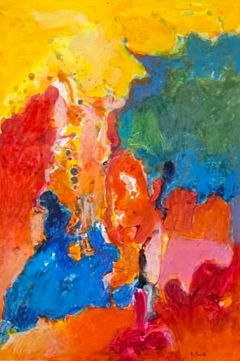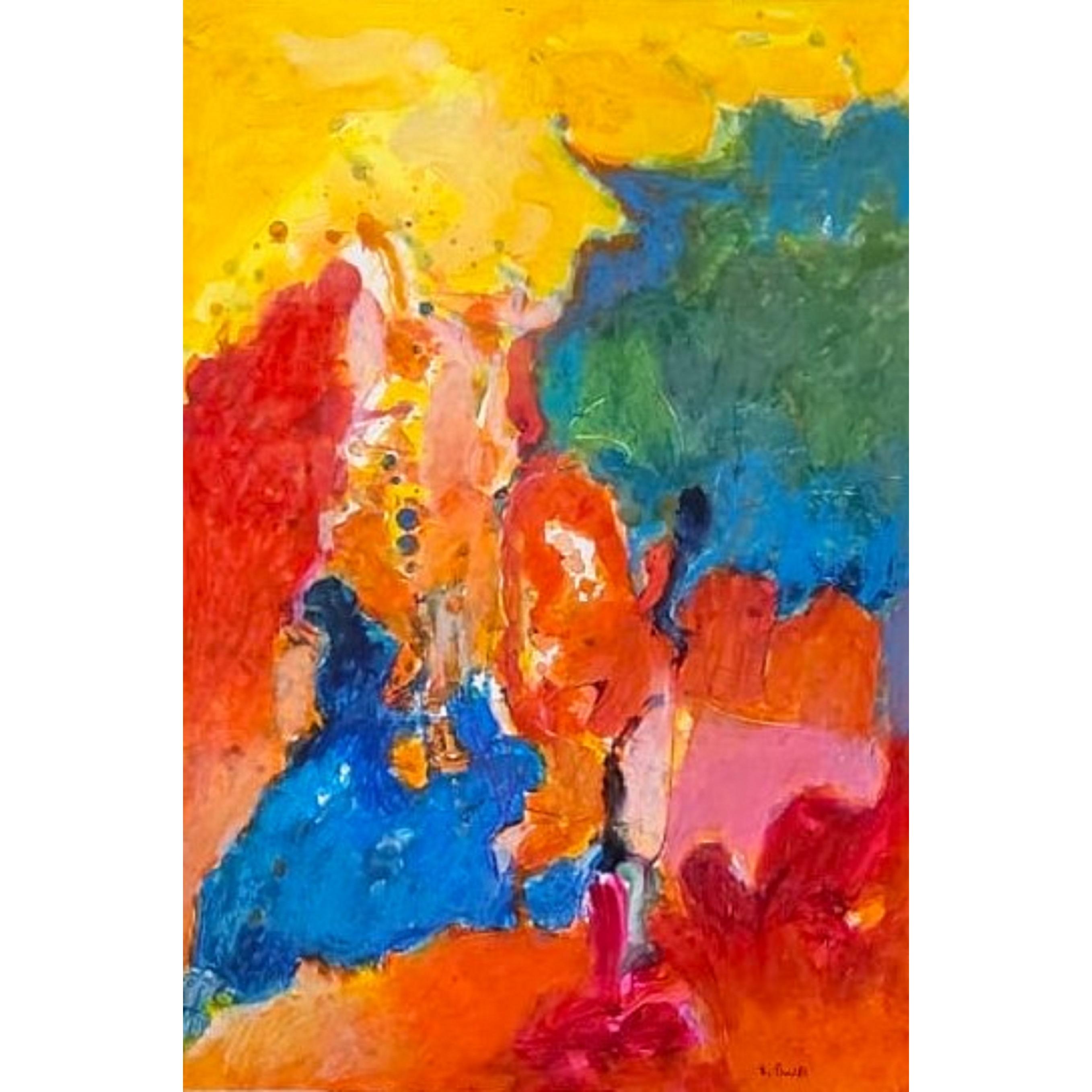Quest’opera colpisce immediatamente per l’intensità cromatica e per la forza gestuale della stesura pittorica. La composizione è dominata da un giallo luminoso che invade lo sfondo come una luce solare diffusa, quasi spirituale, contro cui si stagliano masse di colore rosso, blu e verde, dense e vibranti. Il colore non descrive: costruisce. È materia viva, autonoma, capace di generare spazio e ritmo senza affidarsi a un disegno definito.