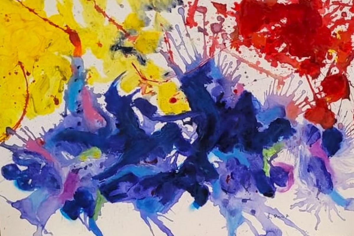 Quest’opera si presenta come un’esplosione emotiva prima ancora che visiva: un campo di battaglia cromatico in cui il colore non descrive, ma agisce. La composizione è dominata da una massa centrale di blu e viola, densa e stratificata, che sembra agitarsi in un movimento centrifugo, mentre ai margini irrompono il giallo e il rosso in contrapposizione violenta. Non c’è figura riconoscibile, ma non c’è neppure puro caos: l’energia è controllata, orchestrata in un equilibrio instabile.