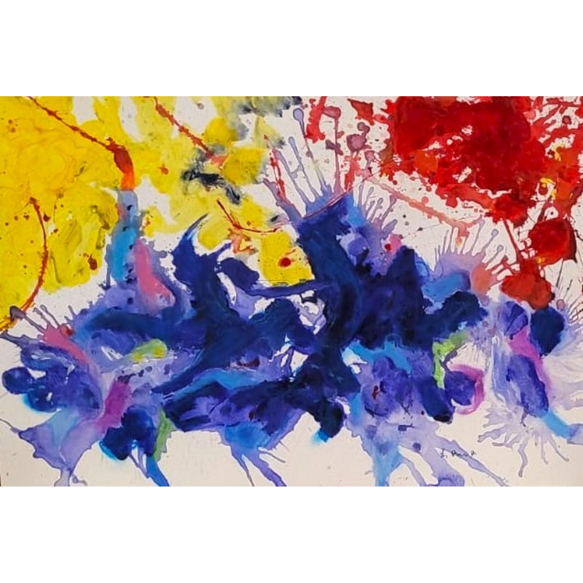 Il blu profondo al centro suggerisce una gravità emotiva, una zona di concentrazione psichica. È un nucleo compatto, quasi organico, che richiama la pittura gestuale dell’Espressionismo Astratto, dove il gesto è traccia dell’interiorità. In particolare, le colature e gli schizzi rimandano alla tecnica del dripping resa celebre da Jackson Pollock, ma qui la dinamica appare meno automatica e più drammatica: non è solo ritmo, è conflitto.
