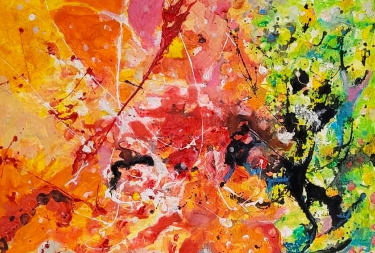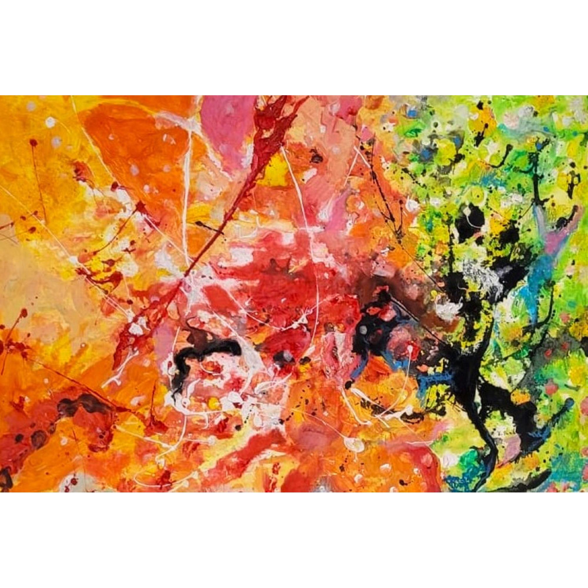 Quest’opera si impone allo sguardo come un’esplosione controllata di energia cromatica, un campo di forze in cui il colore non descrive ma agisce. La superficie è attraversata da una tensione dinamica costante: rossi incandescenti e aranci saturi occupano il centro e la parte sinistra, mentre verdi acidi e neri profondi si addensano sulla destra, generando un dialogo contrastivo che è insieme scontro e bilanciamento.