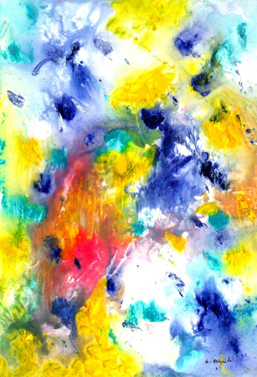 Quest’opera si presenta come un’esplosione cromatica governata da un equilibrio sorprendentemente controllato. A un primo sguardo domina la vitalità del colore: gialli incandescenti, blu profondi, rossi accesi e verdi acquatici si diffondono sulla superficie con un andamento fluido, quasi organico. La tecnica sembra affidarsi a velature e diluizioni che permettono ai pigmenti di espandersi e incontrarsi, generando margini sfumati, fioriture e trasparenze che ricordano processi naturali — fioriture botaniche, correnti marine, vapori atmosferici.