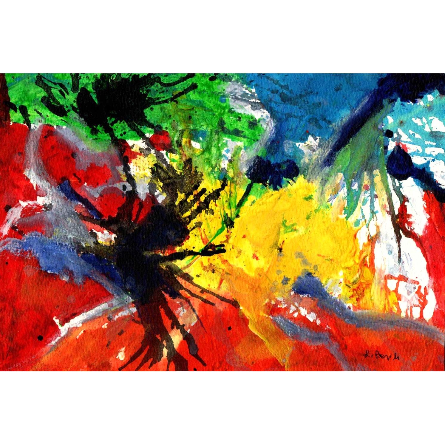 Quest’opera si impone allo sguardo con un’esplosione cromatica immediata, quasi violenta, che richiama la gestualità dell’espressionismo astratto. La superficie è attraversata da campiture primarie – rosso, giallo, verde e blu – che non si limitano a convivere, ma si scontrano, si sovrappongono e si contaminano. Il colore non descrive: agisce.