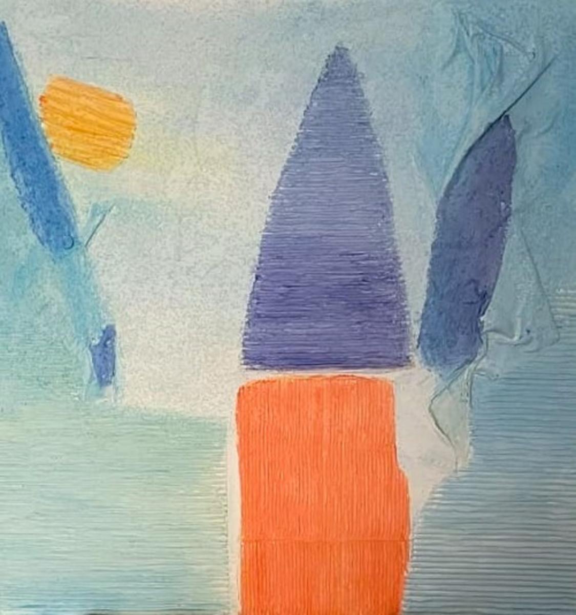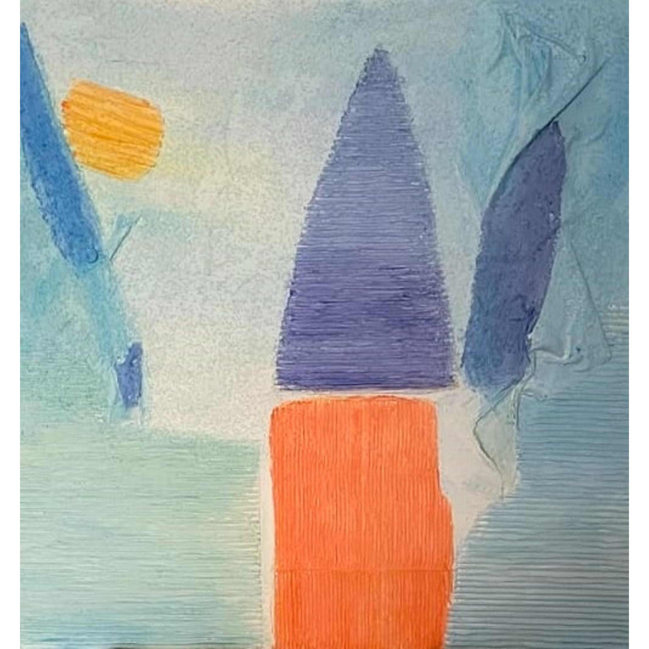 L’opera presenta una composizione essenziale e quasi contemplativa, costruita attraverso forme geometriche semplificate e una palette cromatica limitata ma fortemente evocativa. Al centro della scena emerge una struttura verticale composta da un rettangolo arancione sormontato da una forma triangolare blu-violacea, che ricorda vagamente una torre, una vela o una costruzione architettonica stilizzata. Questa figura centrale funge da fulcro visivo dell’intera composizione, stabilendo un equilibrio tra stabilità e slancio verso l’alto.