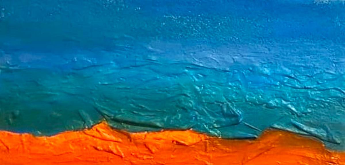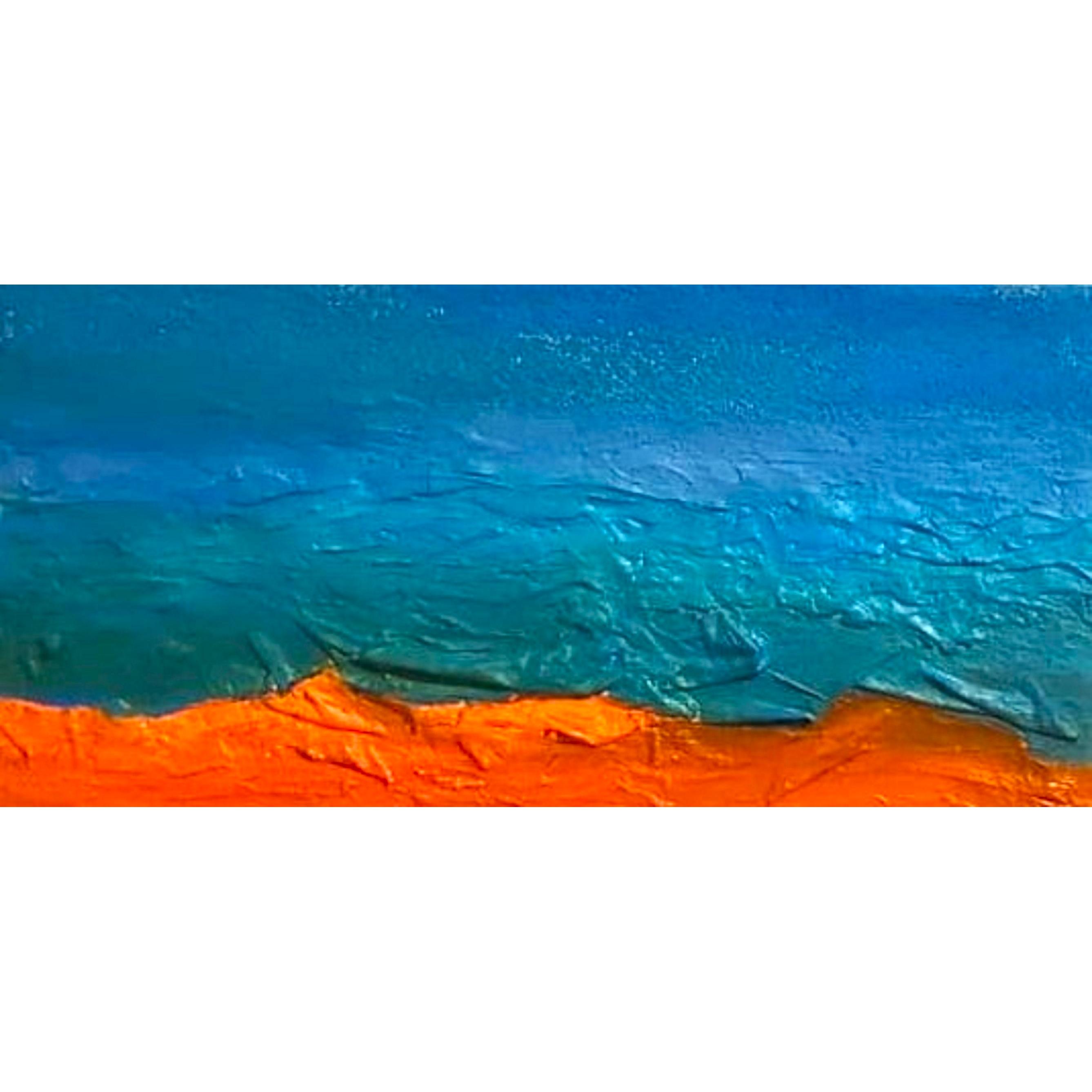 Questa opera presenta un linguaggio visivo essenziale ma allo stesso tempo fortemente evocativo. La composizione è dominata da due grandi campiture cromatiche: il blu intenso nella parte superiore e l’arancione caldo nella parte inferiore. Il contrasto tra questi due colori complementari crea immediatamente una tensione visiva che cattura lo sguardo e suggerisce un dialogo tra elementi opposti, come acqua e terra, cielo e paesaggio, calma e energia.