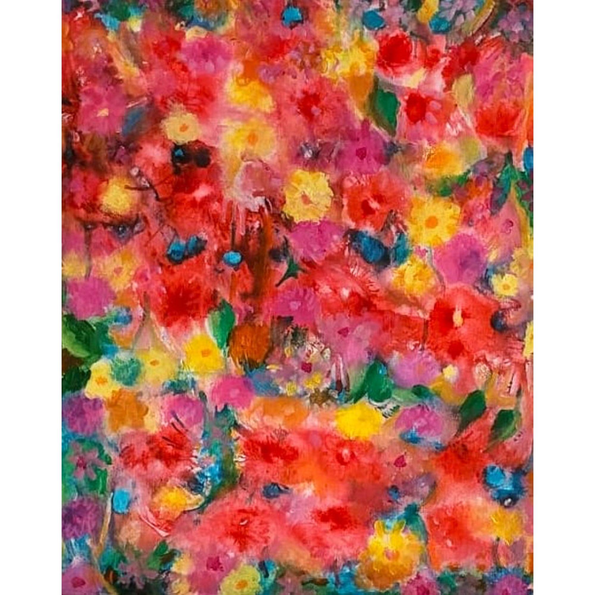 L’opera presentata si configura come un’esplosione cromatica che richiama immediatamente l’universo floreale, ma lo rielabora in chiave fortemente espressiva e quasi astratta. La superficie pittorica è densamente popolata da forme che evocano fiori, petali e foglie, immerse in una trama di colori accesi — rossi, rosa, gialli, verdi e tocchi di azzurro — che sembrano diffondersi e sovrapporsi senza una gerarchia rigida.