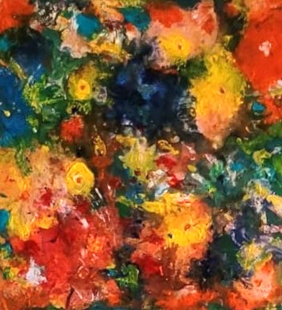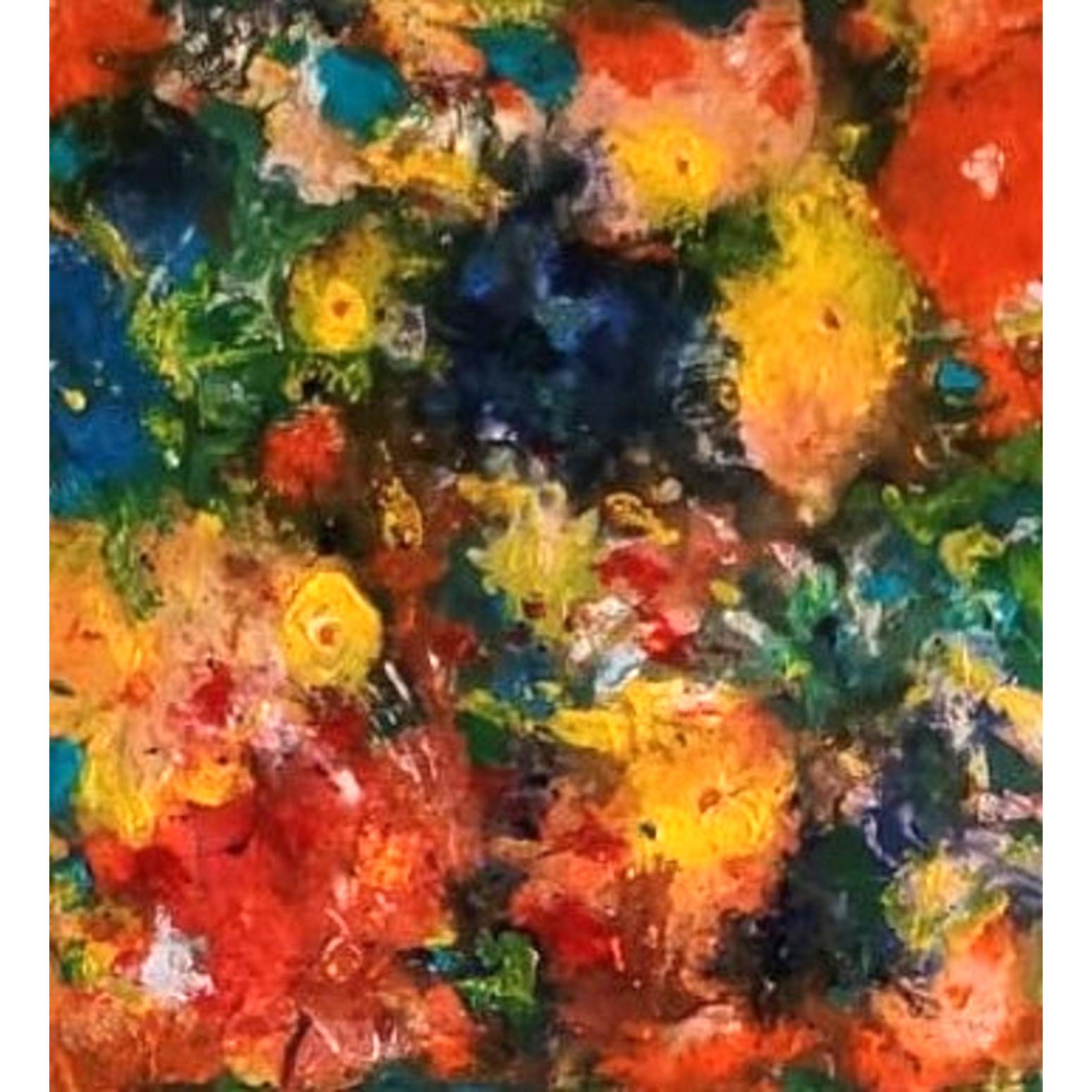 Questa opera colpisce immediatamente per la sua energia cromatica e la forza espressiva del gesto. La superficie è un intreccio vibrante di colori accesi — rossi, gialli, blu e verdi — che si fondono e si scontrano in una composizione dinamica e quasi esplosiva. Non sembra esserci un centro fisso: lo sguardo è costantemente guidato da macchie, spruzzi e stratificazioni che creano un ritmo visivo intenso e coinvolgente.