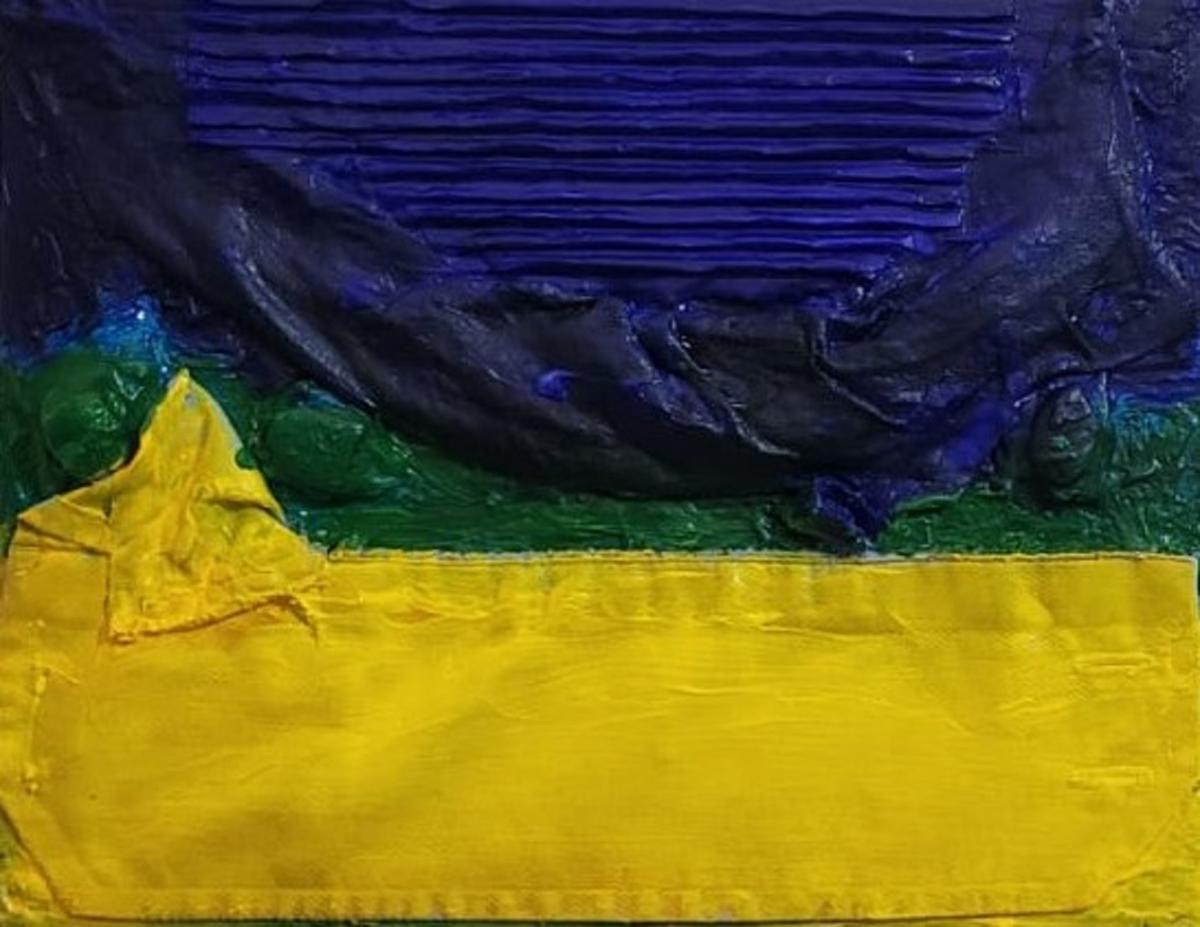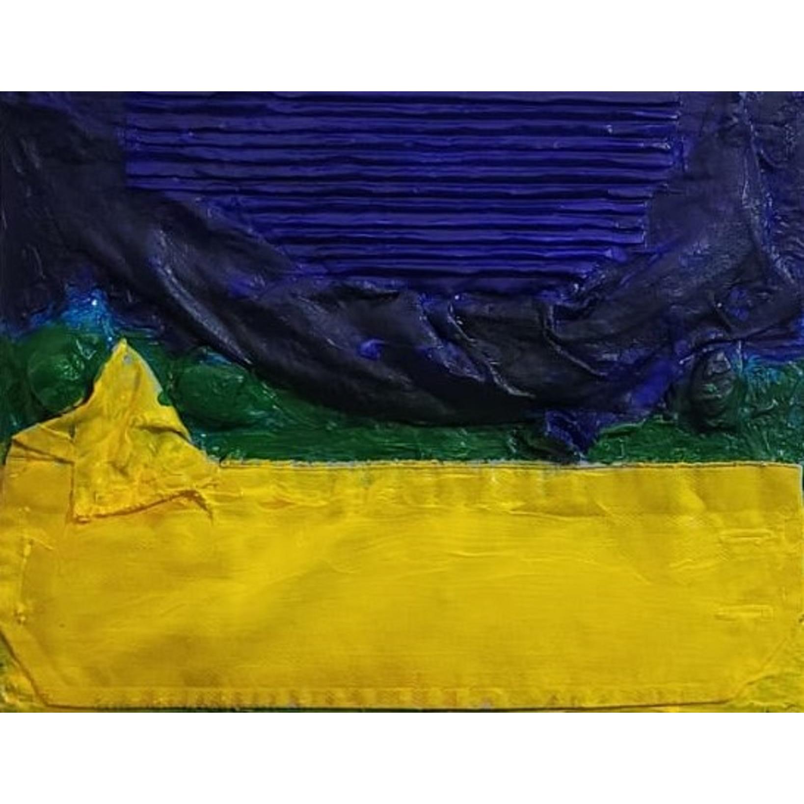 Questa opera colpisce immediatamente per la sua essenzialità e per la forza dei contrasti cromatici. La superficie è dominata da tre fasce principali — blu, verde e giallo — che richiamano una composizione quasi simbolica, ma è la matericità a renderla davvero viva. La pittura non è solo colore: è spessore, gesto, traccia fisica dell’artista.