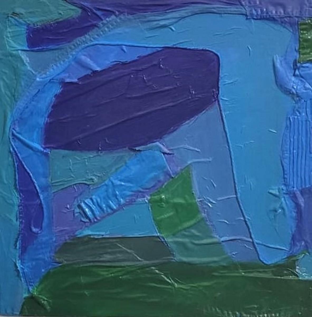 Quest’opera si presenta come una composizione astratta dominata da tonalità fredde — blu, azzurri e verdi — interrotte da una forma scura centrale che cattura immediatamente lo sguardo. La superficie pittorica appare materica, con pennellate visibili e stratificate che suggeriscono un processo gestuale più che una costruzione razionale dell’immagine.